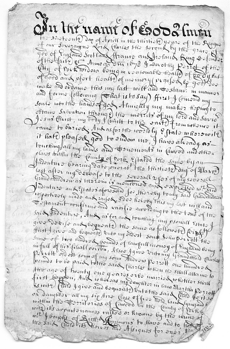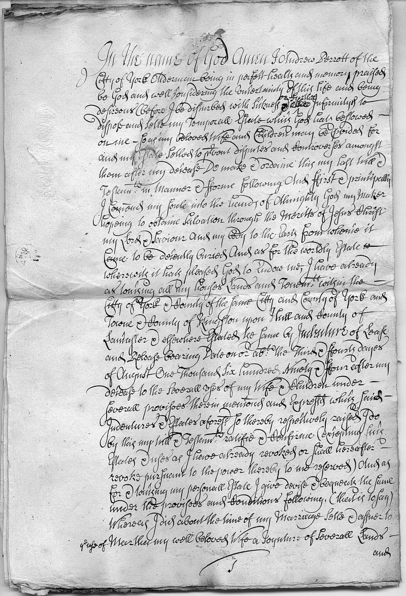 In the name of God Amen I Andrew Perrott of the Citty of York Alderman being in perfect health and memory praised be God and well considering the uncertainty of this life and being desireous (before I be disturbed with sickness & further Infirmity) to dispose and selle my Temporall Estates which God hath bestowed on me - So as my beloved Wife and Children may be provided for and my Estates Selled to prevent disputes and controversies amongst them after my decease Do make & ordaine this my last Will & Testem:t in manner & Fforme follwing and Ffirst & principally I Command my Soule into the hands of Almighty God my maker hoping to obtaine Salvation through the Meritts of Jesus Christ my Lord Saviour and my body to the Earth from whence it Came to be decently buried and as for the worldly Estate wherewith it hath pleased God to Endow me, I have already as touching all my houses Lands and Tenem:ts within the Citty of York & county of Kingston upon Hull and county of Lancaster & elsewhere Estated the same by Indenture of Lease and Release bearing Date on or ab:t the Third & Ffourth dayes of August One Thousand Six hundred Ninety & Ffour after my decease to the severall uses of my Wife & Children under Severall provisoes therein mentioned and Expressed which Said Indentures & states afores:d so thereby respectively raised I do by this my will & Testem:t ratifie & confirme (excepting such estates & uses as I have already revoked or Shall hereafer revoke pursuent to the power thereby to me reserved) And as for & touching my personall Estate I give devise & bequeath the Same under the provisoes and conditions following, (that is to say) Whereas I did about the time of my Marriage Selle & ____ to [y:e wife of] Martha my well beloved Wife a Joynture of Severall Lands and