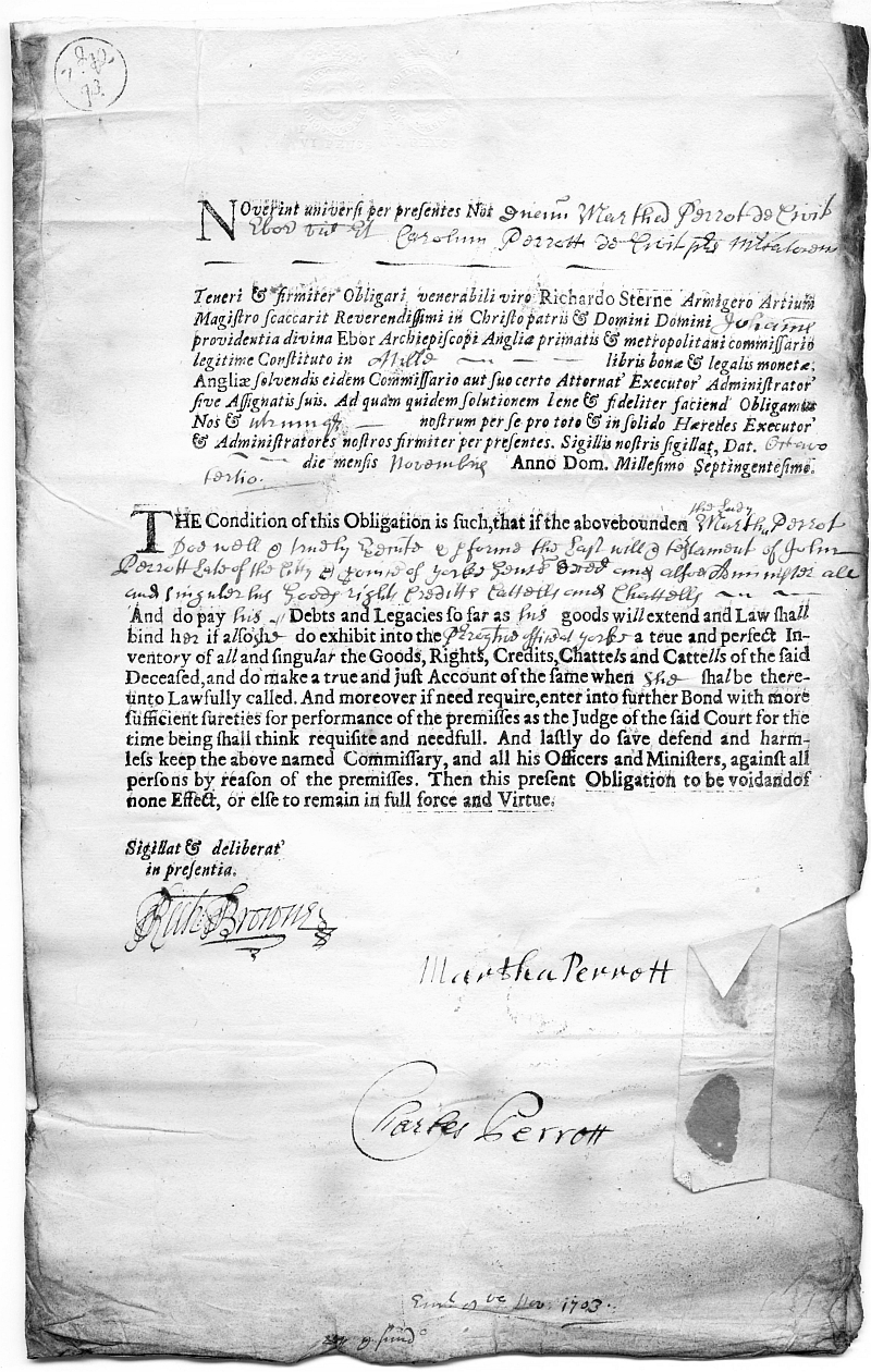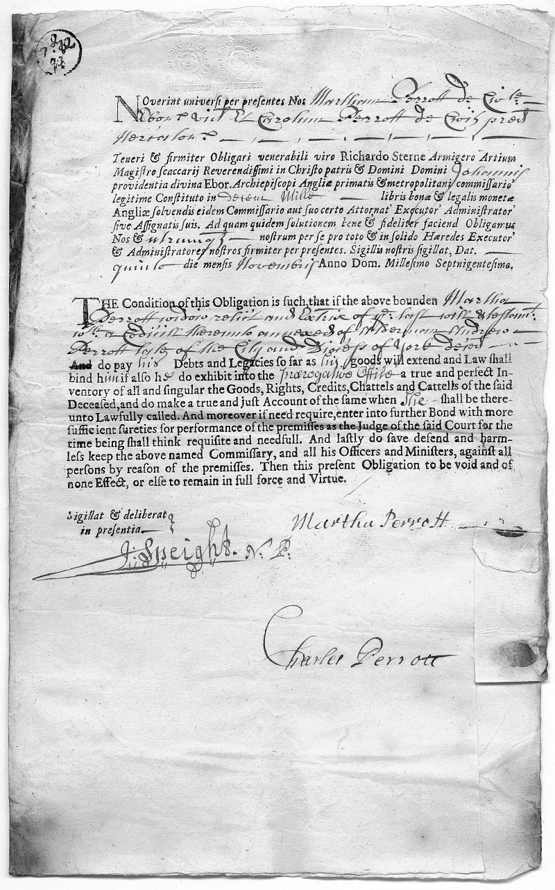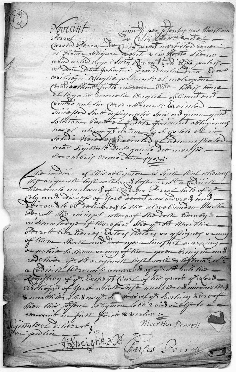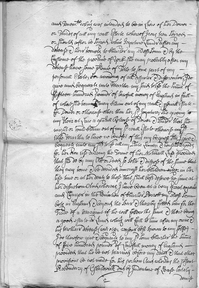 and Tenem:ts which was intended to be in Lieu of her Dower or Thirds of all my reall Estate whereof I ceas lien Seized or Should after be Seized, which Joynture Lands after my decease & hers cometh to charles my eldest Sonn & by the Custome of the province of York She may probably after my decease have some pretence of title to Some part of my personall Estate, for avoiding of all disputes & differences, I do give and bequeath unto Martha my Said Wife the Sume of Ffifteen hundred pounds of lawful money of England in full of what she cann or may claim out of my reall & psenall Estate for Dower or otherwise other than her S:d Joynture, She giveing to my Heire at Law a gen'all Release of Dower & Thirds that she might or could claim out of my S:d reall Estate otherwise my S:d wife Martha to have no benefits of this my bequest Item I give & bequeath unto my S:d Wife all my Plate Linnen & household goods for her own use during the Terme of her Naturall Life provided that she do by any Act or Deed so selle & dispose of the sume that they may come & be devided amongst her children also in her life time or at her death to those that shall best deserve the same at her discretion and whereas I have been at a very great expence and Charges in the education of Charles Perrott my eldest Sonn both in England & beyond the seas & thereby fitted him for the Trade of a merchant if he will follow the Same & there being a good estate in Land which will fall to him after my owne & his mothers decease (with other reasons best known to my selfe) I do therefore give & bequeath to my S:d Sonn charles the sume of five hundred pounds of Lawfull money of England provided that he be not married before my death & that other provisions be not made for his portion And whereas the present Prebendery of Osbaldwick did by Indenture of Lease lately demise