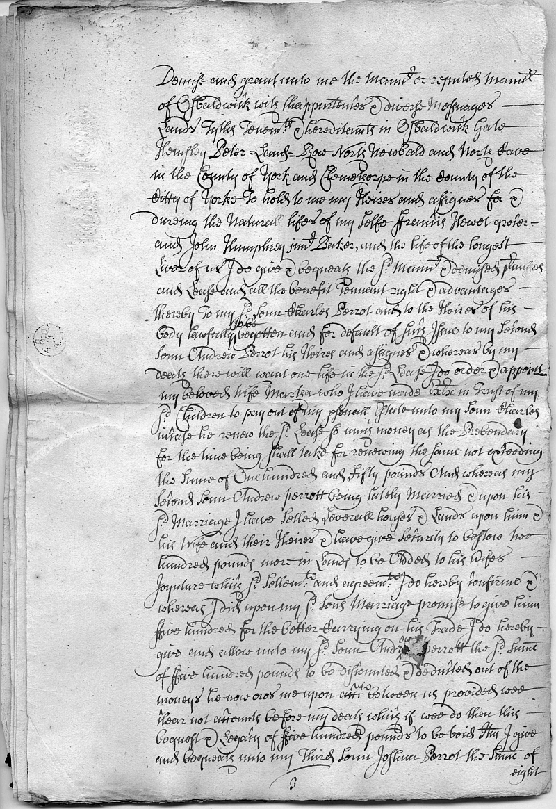 Devise and grant unto me the manner or reputed manner of Osbaldwick with th appurtences & diverse messuanges Lands Tythes Tenem:ts & hereditaments in Osbaldwick Gate Hemsley Peter = Land = Row North Newbald and North cave in the County of York and Clementhorpe in the county of the citty of Yorke To hold to me my Heires and assignes for & during the natural life of my Selfe Ffrancis Hewet grocer and John Humphrey junr Baker, and the Life the longest liver of us I do give & bequeath the s:d manner & devised ______ and Lease and all the benefit Tennant right & advantages thereby To my s:d Sonn charles Perrot and to the Heires of his body lawfully to be begotten and for default of such I give to my second sonn Andrew Perrot his Heires and assignes & whereas by my death then will want one Life in the s:d lease I do ordaine & appoint my beloved wife Martha who I havae made Extrx in Turst of my s:d Children to pay out of my psonall estate unto my son Charles incase he renew the s:d Lease so ____ money as the Prebendery for the time being should take for renewing the same not exceeding the sume of One hundred and fifty pounds And whereas my Second son Andrew perrott being lately married & upon his s:d marriage I have setled severall houses & lands upon him & his wife and their Heires & have give security to bestow two hundred pounds more in Lands to be Added to his wifes Joynture which s:d setlem:t and agreem:t I do hereby confirme & wheras I did upon my s:d sons marriage promise to give him Ffive hundred for the better carrying on his Trade I do hereby give and allow unto my s:d sonn Andrew perrrott the s:d sume of Ffive hundred pounds to be discounted & deducted out of the moneys he now ows me upon __ between us provided wee clear not amounts before my death which if wee do then this bequest & Legacy of Ffive hundred pounds to be boid Item I give and bequeath unto my Third sonn Joshua Perrot the sume of eight