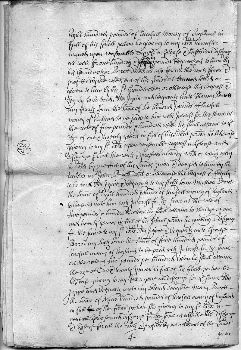 Eight hundred pounds of lawfull money of England in full of his filiall position he giveing to my Extrx hereafter named upon reasonable request or Release & sufficient discharge as well for one hundred & Ffifty forty pounds bequeathed to him by his grandmother Perrott dece'd as also for all the rents Fines & profitts by me rece'd out of his Lands at cawood setled or given to him by his s:d Grandmother or otherwise this bequest & Legacy to be paid, Item I give and bequeath unto Thomas Perrott my fourth Sonn the summe of Six hundred pounds of lawfull money of England to be pade to him with Interest for the same at the rate of five pounds p hundred when he shall attaine to ye age of one & twenty yeares in full of his filiall porc'on he likewise giveing to my s:d Extrx upon reasonable request a Release and discharge for all the rents & proffitts already rec'd or which may be rec'd by me out of his Lands given & devised to him by his Unckle mr John Perrott dec'd or otherwise this bequest & Legacy to be void Item give & bequeath to my ffith sonn Mathew Perrot the sume of Eight hundred pounds of lawfull money of England to be paid unto him with Interest for the same at the reate of five pounds p hundred when shall attaine to the age of one and twenty yeares in full of his filiall porc'on he giveing a discharge for the same to my s:d Extrx, Item I give & bequeath unto George Perrot my sixth sonn the sume of five hundred pounds of lawfull money of England to be paid with Interest for the same at the rate of five pounds per hundred when he shall attaine the age of One & twenty Yeares in full of his filiall portion he likewise giving to my Extrx a generall discharge for ye same Item I give and bequeath unto my second daughter Mary Perrot the sume of Nyne hundred pounds of Lawfull money of England in full for of her filiall portion she giveing to my s:d Extrx a general Release and discharge for the same as also the like dischage & release for all these rents & profitts by me rec'd out of the Lands given