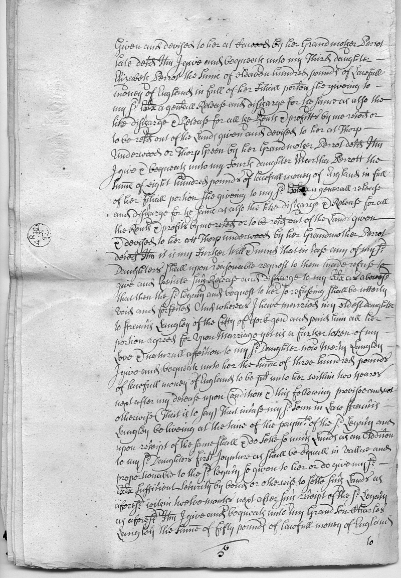 Given and devised to her at cawood by her Grandmother late dec'd Item I give and bequeath unto my Third daughter Elizabeth Perrot the sume of eleven hundred pounds of Lawful money of England in full of her filiall porc'on she giveing to my s:d Extrx a general Release and discharge for the same as also the like discharge & Release for all the Rents & profitts by me rec'd to be rec'd out of the Lands given and devised to her at Thorpe Underwood or Thorpe Green by her Grandmother Perrot dec'd Item I give & bequeath unot my fourthe daughter Martha Perrott the sume of eight hundred pounds of lawful moeny of England in full of her filiall portion she giveing to my s:d Extrx a generall relase and discharge for the sume as also discharge & relase for all the Rents & profits by me rec'd or to be rec'd out of the Lands given & devised to her att Thorp underwood by her Grandmother Perrot dec'd Item it is my further will & mind that in case any of my s:d Daughters shall upon reasonable request to them made refuse to give and execute such Release and discharge to my Extrx as above s:d that then the s:d legacy and bequest to her so refusing shaall be utterly void and forfeited And w`hereas I have married my eldest daughter to Ffrancis Langley of the Citty of York gen and paid him all her protion agreed for upon Marriagea yet as a further token of my love & naturall affection to my s:d Daughter now Mercy Langley I give and bequeath unto her the sume of three hundred pounds of lawful money of England to be p'd unto her within two yeares next after my decease upon Condition & this following provisoe and not otherwise (That is to say) That in case my s:d sonn in Law Francis Langley be liveing at the time of the paym:t of the s:d Legacy and upon receipt of the same shall & do setle so with Lands as an Addic'on to any s:d Daughters first Joynture as shall be equall in value and proportionable to the s:d legacy so given to her or do give my s:d Extrx sufficient security by bond or otherwise to setle such Lands as afores:d Item I give and bequeath unto my grand son charles Langley the sume of fifty pounds of lawfull money of England to