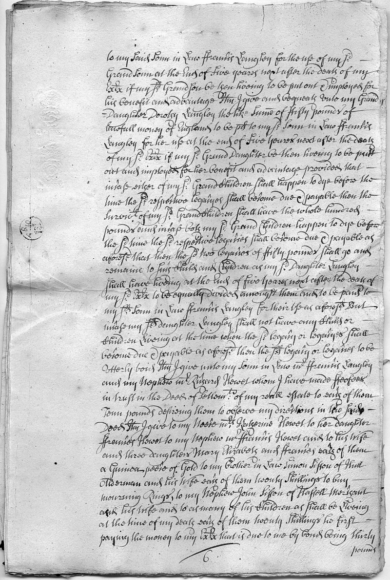 to my said sonn in Law Ffrancis Langley for the use of my s:d Grand son at the End of five yeares next after the death of my Extrx if my s:d Grand son be then living to be put out & imployed for his benefit and advantage Item I give and bequeath unto my Grand Daughter Dorothy Langley the like sume of Ffifty pounds of lawfull money of England to be p'd to my s:d son in Law Ffrancis Langley for her use at the end of five yeares next after the death of S:d Extrx if my s:d Grand Daughter be then liveing to be putt out and imployed for her benefit and advantage provided that in case either of my s:d Grandchildren shall happen to dye before the time the s:d respective legacyes shall become due & payable then the surviv'g of my s:d Grandchildren shall have the whole hundred pounds and in case both my s:d Grand Children happen to dye before the s:d time the s:d respective legacies shall become due & payable as afores:d that then the sd two legacies of ffifty pounds shall go and remaine to such child and Children as my s:d Daughter Langley shall have liveing at the End of five yeares next after the death of s:d Extrx to be equally divided among them and to be paid to my s:d sonn in Law Francis Langley for their use as afores:d But in case my s:d Daughter Langley shall not have any child or children Liveing at the time when the s:d legacy or legacyes shall become due & payable as afores:d then the s:d legacy or legacies to be utterly void Item I give unto my sonn in Law mr Ffrancis Langley and my Nephew Mr Richard Hewet whom I have made ffeofees in trust in the Deed as follow:t of my reall estate to each of them Tenn pounds desireing them to observe my directions in the said deed Item I give to my Neece Mrs Katherine Hewet to her daughter Frances Hewet to my Nephew mr Francis Hewet and to his Wife and three daughters Mary Elizabeth and Ffrances each of them a Guinea peece of Gold to my brother in Law Simon Sisson of Hull Alderman and his Wife each of them twenty Shillings to buy mourning Rings, to my Nephew John Sisson of Hassell [sic, Hessle] merchant and his wife and to as many of his children as shall be Living at the time of my death each of them twenty shillings he first paying the money to my Extrx that is due to me by bond being thirty pounds
