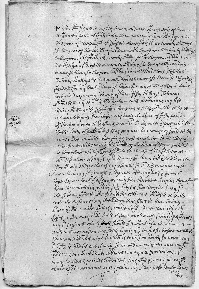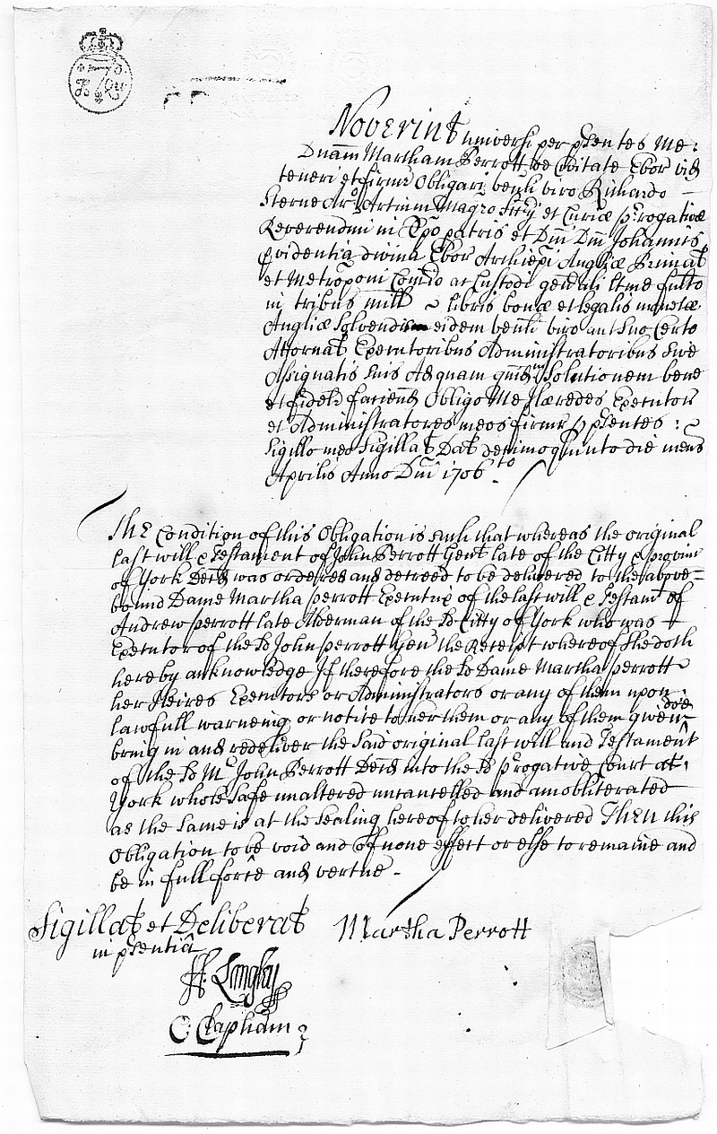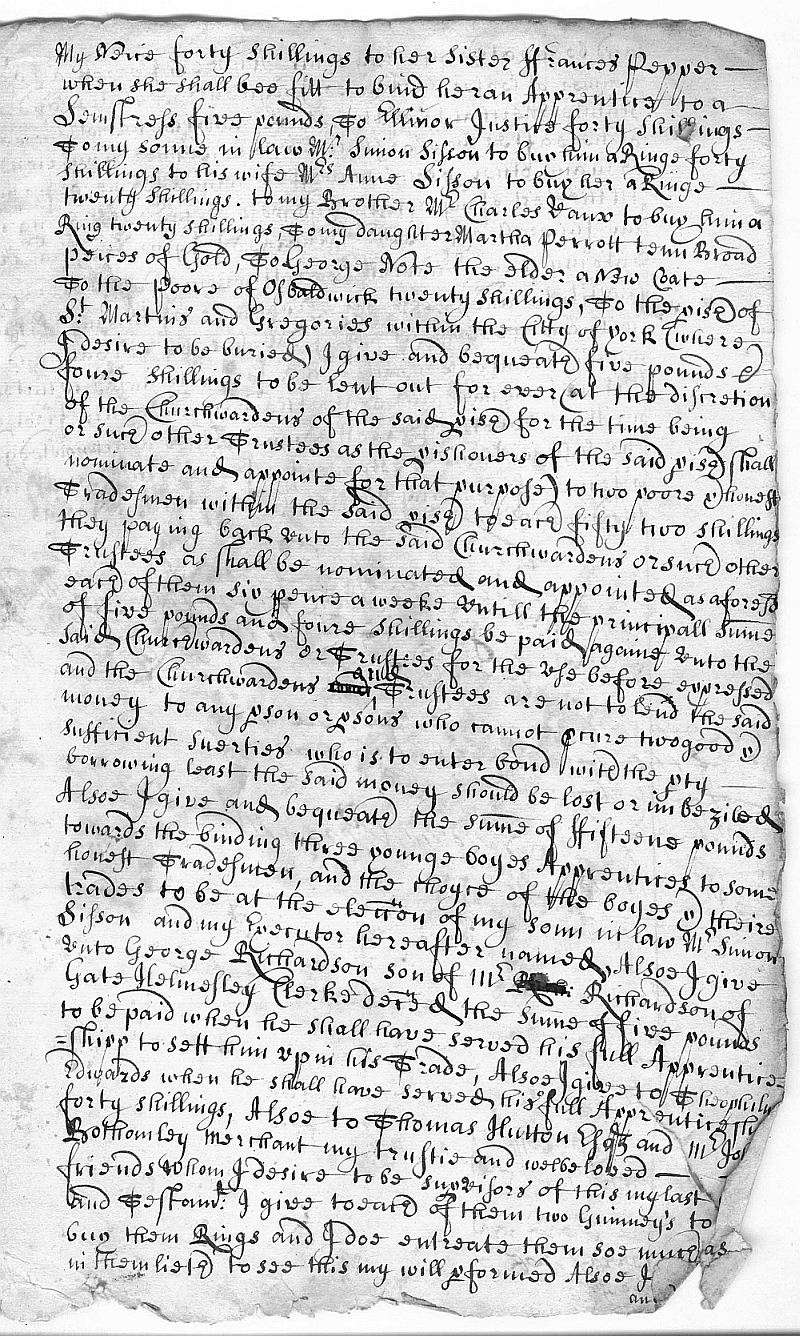 pounds. Item I give to my Nephew and Neece _____ each of them Guinea peice of Gold to buy them mourning Rings Item I give to the poor of the parish of Hassell where I was borne twenty shillings To the poor of the parish of s:t martins where I now live twenty shillings to the poor of Osbaldwick twenty shillings To the poor widdows in the Merchants Hospitall twenty shillings to be equally devided amongst them, to the poor widdows in ___ Middletons Hospitall Twenty shillings to be equally devided amongst them To Elizabeth Cundell sp'r my serv:t & Marg't Caisson sp'r my serv:t if they continue with me during my life each of them fifty shillings, to Mary Broadbolt my Serv:t if she continiw with me during my life Thirty shillings To Joseph Ffawthropp my late Apprentice if he be not gone gone beyond seas before my death the sume of fifty pounds of lawfull money of England towards his Expenses & ____ there To the citty of York incase they pay me the moneys expended by me in severall suites brought against in relation to the Tolls & other matters belonging the s:d citty the sume of Tenn pounds to be bestowed in a peice of Plate for the use of this s:d citty at the discretion of my s:d Extrx Item my farther mind & will is and I do hereby declare that if my psonall Estate doth amount unto more than my s:d bequests & legacyes after my debts & funerall Expences are paid & discharged and that there be a surplus thereof that then one third part of such surplus shall be pade to my s:d eldest sonn charles Perrot and the other two Thirds to be paid unto the residue of my s:d children that shall be then living share and & share alike But if providence so order it that either by losses at, sea or by badd debts at Land or otherwise (which God pr'vent) my s:d personall estate shall should fall short of what it now is and will not answer my Debts legacyes & bequests before menc'ond then my will and mind further is and I do hereby Impower my s:d Extrx to deduct out of each sume of moneys given unto my s:d Children (my son charles excepted) an equall __ portion out of every hundred pounds suitable to such Loss & want in my s'd effects & I do nominate and appoint my Dear Wife Martha Perrot Extrx