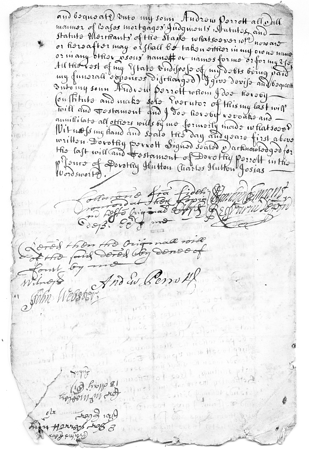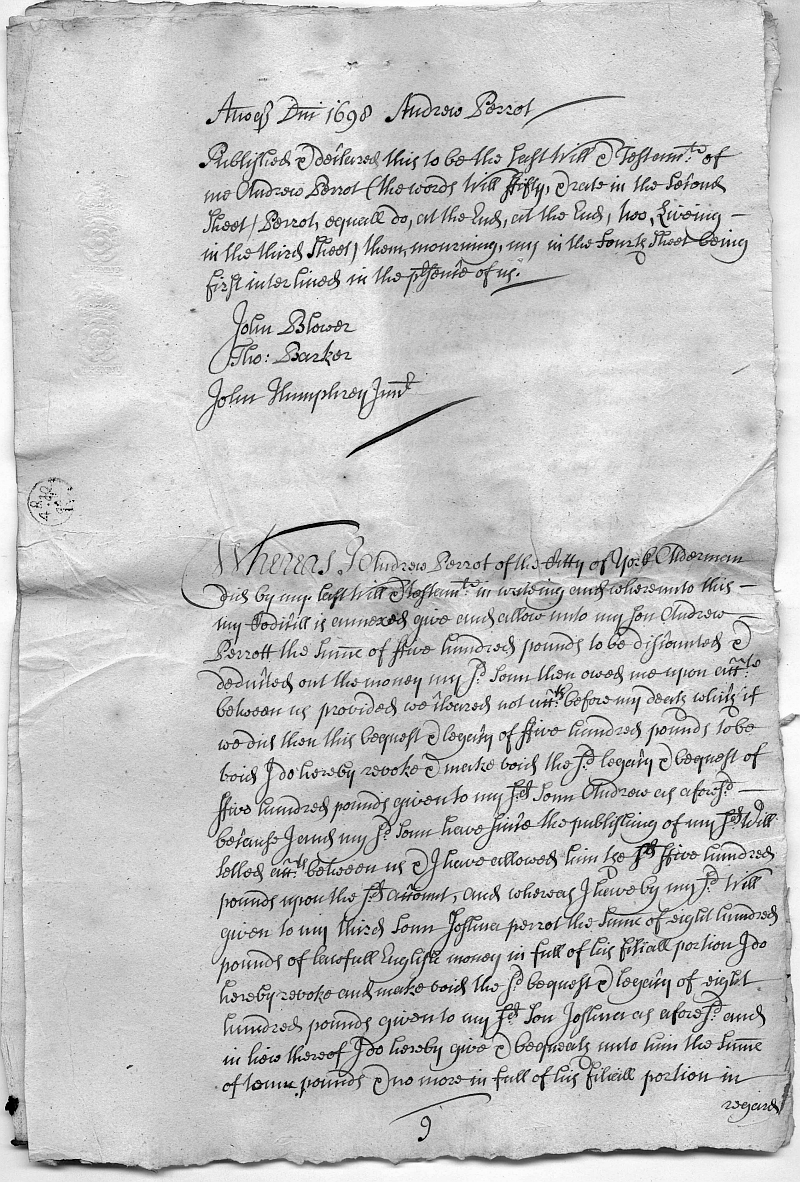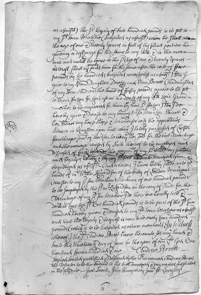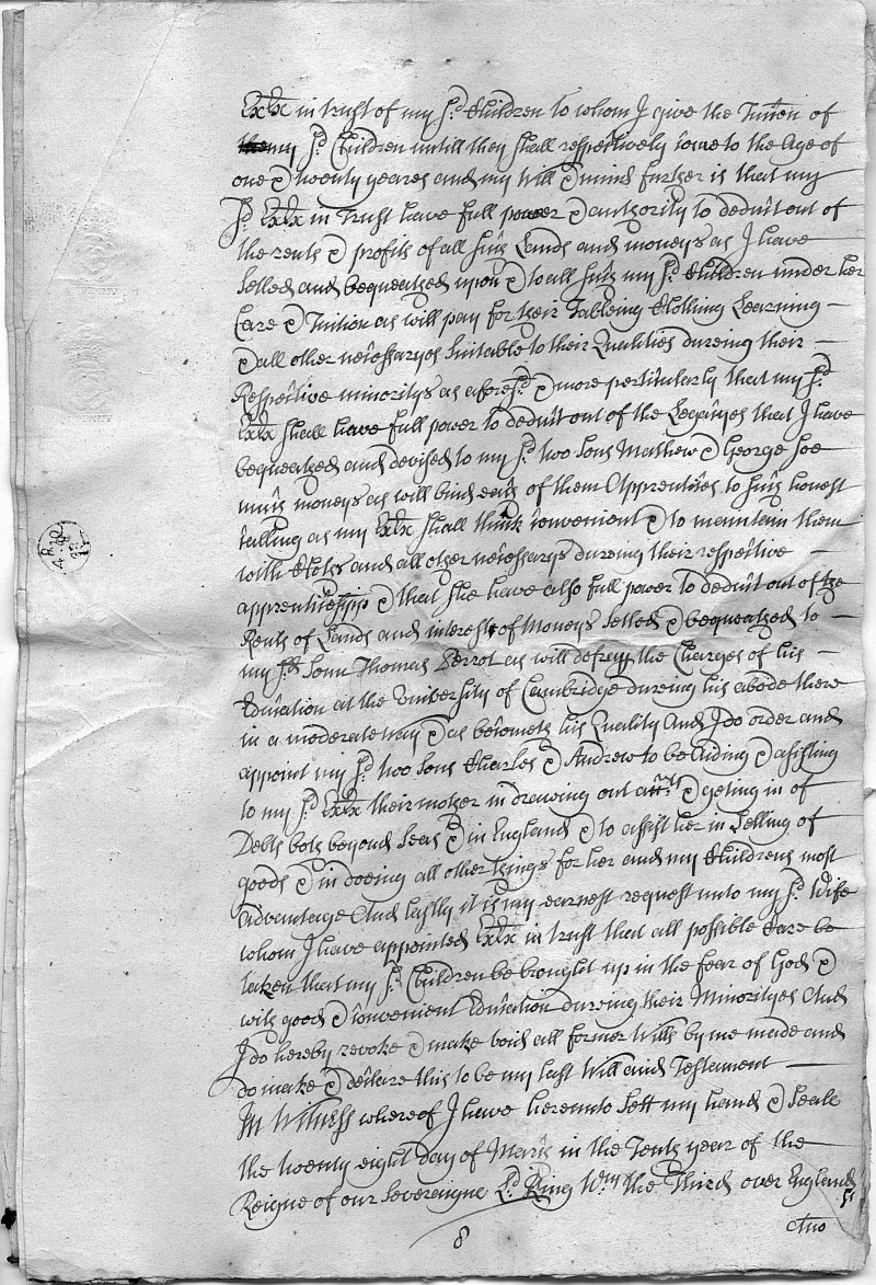 Extrx in trust of my s:d children to whom I give the Tuition of the my s:d Children untill they shall respectively come to the age of one & twenty yeares and my will & mind further is that my s:d Extrx in full trust have full power & authority to deduct out of the rents & profits of all such Lands and moneys as I have setled and bequeathed upon & to all such my s:d children under her Care & tuition as will pay for their Tableing clothing Learning & all other necessaryes suitable to their Qualities during their Respective minoritys as afores:d & more perticularly that my s:d Extrx shall have full power to deduct out the Legacyes that I have bequeathed and devised to my s:d two sons Mathew & George soe much moneys as will bind each of them Apprentices to such honest calling as my Extrx shall think convenient & to maintain them with cloths and all other necessarys during their respective aprrenticeships & that she have also full power to deduct out of the the Rents of Lands and interest of moneys setled & bequeathed to my s:d sonn Thomas Perrot as will defray the Charges of his Education at the University of Cambridge during his abode there in a moderate way & as becometh his Quality and I do order and appoint my s:d two sons charles & andrew to be aiding & assisting to my s:d Extrx their mother in drawing out ____ & geting in of Debts both beyond seas & in England & to assist her in selling of goods & in doeing all other things for her and my childrens most advantage And lastly it is my earnest request unto my s:d Wife whom I have appointed Extrx in trust that all possible care be taken that my s:d Children be brought up in the fear of God & with good & convenient Education during their minorityes And I do hereby revoke & make boid all former Wills by me made and do makes & declare this to be my last Will and Testament In Witness whereof I have hereunto sett my hand & seale the twenty eight day of March in the Tenth year of the Reigne of our sovereigne L:d King W:m the Third [1698/9] over England ano