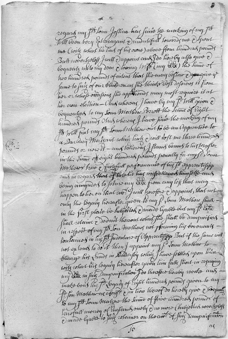 regard my s:d sonn Joshua has since the making of my s:d Will been very Extravant & undutifull towards me & spent me (with what he had of his owne) above ffour hundred pounds Butt nevertheless I will & appoint and I do hereby also give & bequeath unto my dear & loving Wife (my Extrx) the sume of two hundred pounds of intent that she may bestow & give ye sume to such of our children as she thinks best deserves it from her or whose occasions she apprehends may most require it at her own election And whereas I have by my s:d Will given & bequeathed to my sonn Mathew Perrott the sume of Eight hundred pounds And whereas I have since the making of my s:d Will put my s:d sonn Mathew out to be an apprentice to a Barbary Merchant which hath & will cost me three hundred pounds or more it -- and whereas I Hand bound to his Master in the sume of eight hundred pounds penalty for my s:d sonn Mathew true & faithfull performace of his s:d apprentisipp and in regard that of late he has misbehaved himselfe and being amynded to secure my Extrx from my loss that may happen to her on that acc:nt I will therefore & appoint, that not only the legacy hereafter given to my S:d sonn Mathew shall in the first place be subjected & made lyable but my s:d Extrx shall retaine & deduct thereout what she shall be dampnified in respect of my s'd son Mathews not pforming his covenents contained in his s:d Indenture of Apprentisipp But if the same will not extend to do it then I appoint my s:d sonn Mathew to charge his Lands in Baldersby which I have settled upon him with what his legacy hereafter given him falle short in repaying my Extrx in such Dampnification I do therefore hereby revoke and make void the s:d Legacy of Eight hundred pounds given to my s:d son Mathew as afores:d & in liew thereof do hereby give & bequeath to my s'd son Mathew the sum of five hundred pounds of lawful money of England onely & no more (subjected nevertheless & made lyable to such retainer on the acc:nts of such dampnification as