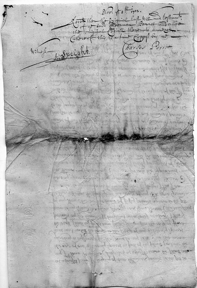 Rece'd then the original last will and testatm:t of ye said Alderman Perrott and also the original Codisill thereunto annexed (whereof this is a true Coppy by me Charles Perrott Witness I. Speight