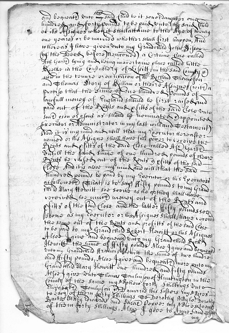Item I give and bequeath unto my Son Robert Hewitt a Certain tract of lande lyeinge in Cowad [sic, should be Cawood] shire nere ye Citty of Yorke wch was left mee by my Grandmother Mrs. Dorothy Perrott, and now in ye handes of my Uncle Mr- Andrew Perrott and yeildinge Six pounder Sterl pr annum to his heires and assignes for ever butt its my will intent and meaninge that Mr. Robert Sanderson of Hull woolen draper have ye first two yeares rent I beinge in debt in him about that sume and that my Daughter Sarah shall have out of ye rents & profitts of ye said lande ye Sume of Eighty poundes Sterl. & in case my said Son Robert shall dye wthout heires of his body lawfully be-gotten or before lee come to ye age of Twenty one yeares then I give my said lande to my Daughter Sarah & her heires and assignes for ever payinge two yeares rent to Mr. Robert Sanderson Also it is my will intent & meaninge that if ye said Lande fail to my Daughter Sarah that then Mary Howson, Anne Behealand & Sarah Howson shall have ye next foure tents after Mr. Sanderson everyone haveinge accordingle to their age begininge wth Mary first, And it is further my will intent and meaninge that if my sd Daughter Sarah shall dye wthout heires. then I give ye said lande to my Sister Mary Hewitt if liveinge & her heires & assignes forever. She payinge ye abovesaid Debt & legacies butt in case of her Death then I give ye said lande to Andrew Perrott Sone of Andrew Perrott in York Mercht to him his heires and assignee for ever, And I appoint my Uncle Andrew Perrott if liveinge to see ye prmises performed and to make the utmost of ye rents as they come due, for ye use of ye above said Robert & Sarah Hewitt, butt in case hee bee dead, I appoint my Brother Francis Hewitt to take it into his handes and see yt performed