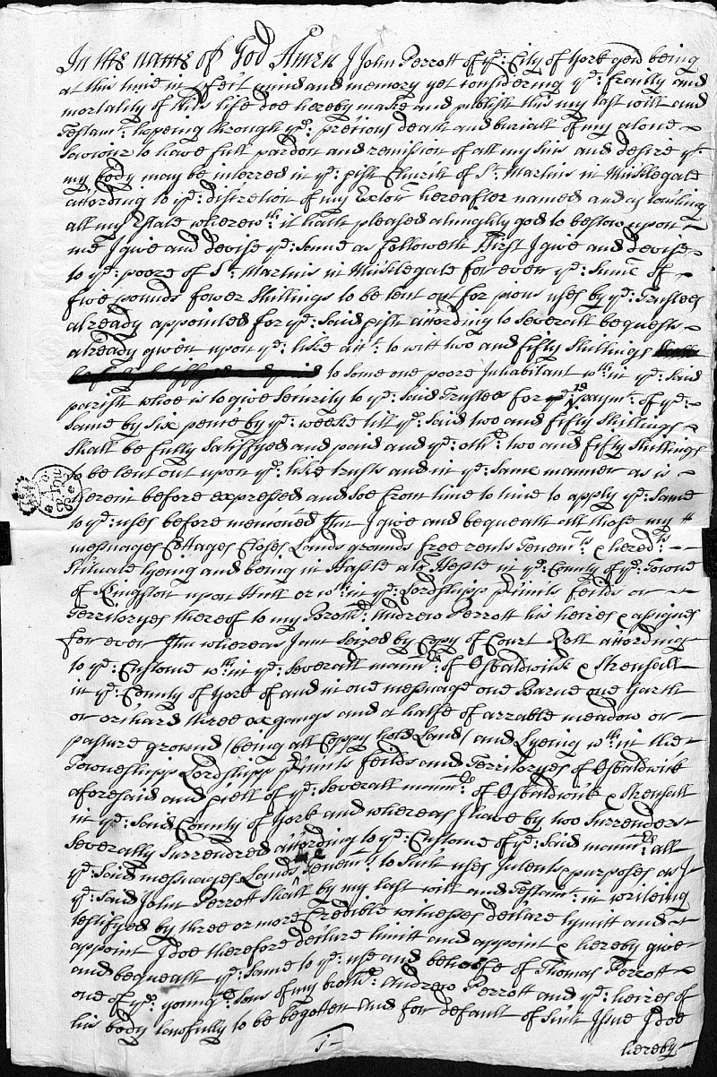 In the name of God Amen I John Perrott of ye: City of York ____ being at this time in pfct mind and memory yet considering ye: freilty and mortality of this life doo herby mae and publish this my last will and Testam:t hoping through ye: precious death and buriall of my alone Saviour to have full pardon and remission of all my Sins and desires yet my body may be interred in ye: pish Church of St: Martins in Micklegate according to ye: discretion of my Extor hereafter named and as following all my Estate where:th it hath pleased almighty god to bestow upon me I give and devise ye: same as followeth ffirst I give and devise to ye: poore of St: Martins in Micklegate forever ye: sume of five pounds fower Shillings to be lent out for pious uses by ye: Trustees already appointed for ye: said pish according to Severall bequeaths already ____ upon ye: like _______ to with two and fifty Shillings to Some one poore Inhabitant w:thin ye: Said parish whoe is to give Security to ye: Said Trustees for __ paymt of ye: Same by six pence by ye: weeke till Said two and fifty Shillings shall be fully satisffyed and paid and ye: oth:r two and fifty Shillings to be lent out upon ye: like trusts and in ye Same manner as is herein before exposed and soe from time to tome to apply ye: Same to ye: usses before mentioned Item I give and bequeath all those my messuages Cottages Closes Lands grounds free rents Tenem:ts & hered:ts scituate lyeing and being in ___ also ____ in ye: County of ye: ____ of Kingston upon ___ or w:tt in ye: Lordshippe permits feilds or Territoryes thereof to my Brother Andrew Perrott his heirs & assigns forever Item whoever I owe Seized by Copay of Court Roll according to ye: Custome w:thin ye: Severall ___ of Osbaldwick & Strensall in ye: County of York of and in one messuage one Barne one garth or orchard three oxgangs and a halfe of arrable meadow or pasture ground being all Coppy hold Land and Lyeing w:thin the Townshipp Lordshipp permits feilds and Territoryes of Osbaldwick aforesaid and ____ of ye: Severall ____ of Osbaldwick & Strensall in ye: Said County of York and whereas I have by two surrender Severeally Surrendred according to ye: Customs of ye: Said ___ all ye: Said messuages Lands & Tenem'ts to Such uses Intents & purposes as I ye: Said John Perrott Shall by my last will and Testam:t in writing testified by three or more Credible witneses declare lymitt and appoint I doe therefore declare limit and appoint & hereby give and bequeath ye: Same to ye: use and behoofe of Thomas Perrott one of the ye: young:st Sons of my brothe: Andrew Perrott and ye: heires of his body lawfully to be begotten and for default of Such Issue I doe hereby P 2 |