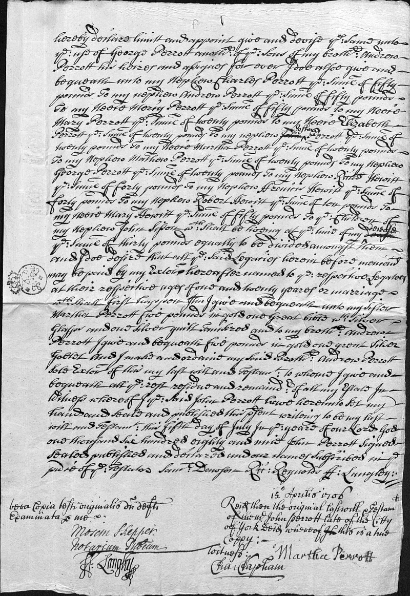 as afores'd) the s:d legacy of five hundred pounds to be pd to my s:d sonn Mathew (subjected as afores:d) when he shall attaine the age of one & twenty yeares in full of his filiall portion he giving a discharge for the same to my Extrx & in the mean time and untill he come to the s:d age of one & twenty yeares interest shall be yearly paid him for the sume after the rate of ffive pounds by the hundred (subjected nevertheless as afores:d ) Item I give to my grand Daughters Dorothy and Ann Perrott (the daughthers of my son Andrew) the sume of Ffifty pounds apeece to be p'd to their father for their use at the death of my Extrx their Grandmother to be improved for them by their s:d Ffather) Item I do hereby give & devise to my loving wife Martha Perrott & her Heires my house shopp & Warehouses with the appurtences scituate in Kingston upon hull which I lately purchased of Crisf'er Ffawthrop jun'r of Hockton to be by her sold for the best advantage and the moneys raised by Saile thereof to be imployed and disposed of for & towards the paym't of my s:d childrens porc'ons and legacyes hereby & by my s::d Will hereunto annexed given & bequeathed as afores:d - and whereas I have lately pade into ye hands of mr Will'm `Richardson of the citty of London Merchant master to my s:d son Mathew) the sume of one hundred pounds to be Imployed by the s:d mr Richardson in the way of Trade for the Advantage of my s:d son Mathew I do therefore hereby Will & declare that the s:d one hundred pounds is be part of the s:d five hundred hereby given & devised to my s:d sonn Mathew as afore:d and that the legacy & bequest is now to be onely four hundred pounds (which is to be subjected as above mention'd) In Withness whereof I the s:d Andrew Perrot have hereunto forming hand & seal this nineteenth day of June in the year of L:d God One thousand sevenhundred & one Andrew Perrott signed sealed published & declared by the within named Andrew Perrot the Testator to be the codicill to his will annexed & our names subscribed in his pr'sence - Joel Lovick, John Humphrey Jun'r F:s Langley.