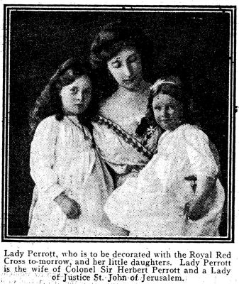 At the oubreak of the Great War the national advantage of the excellent training whcih the Nursing Divisions had been receiving became immediately apparent; inasmuch as Lady Perrott was able to send out at once a larage number of members versed in hospital routine and ready to act as probationers to trained nurses in war zones. The despatch of nursing sisters was not, however, the only War-time service in which Lady Perrott was interested. In August, 1914, a Women's Committee of the Order of St. John of Jerusalem had been instituted, of which Lady Perrott was honorary secretary. This committee was responsible for the formation of the St. John Warehouse, where necessities for the relief and comfort of soldier patients were made and despatched. Lady Perrott was a member of the original committee for the organization of the St. John Ambulance Brigade Hospital in France. She was the means of collecting some £17,000 for the support of this hospital. She went to France and worked personally in the hospital and was actually there during the time when the hospital came under enemy fire. In 1915 her services had already proved so valuable that she was decorated with the R.R.C. First Class.