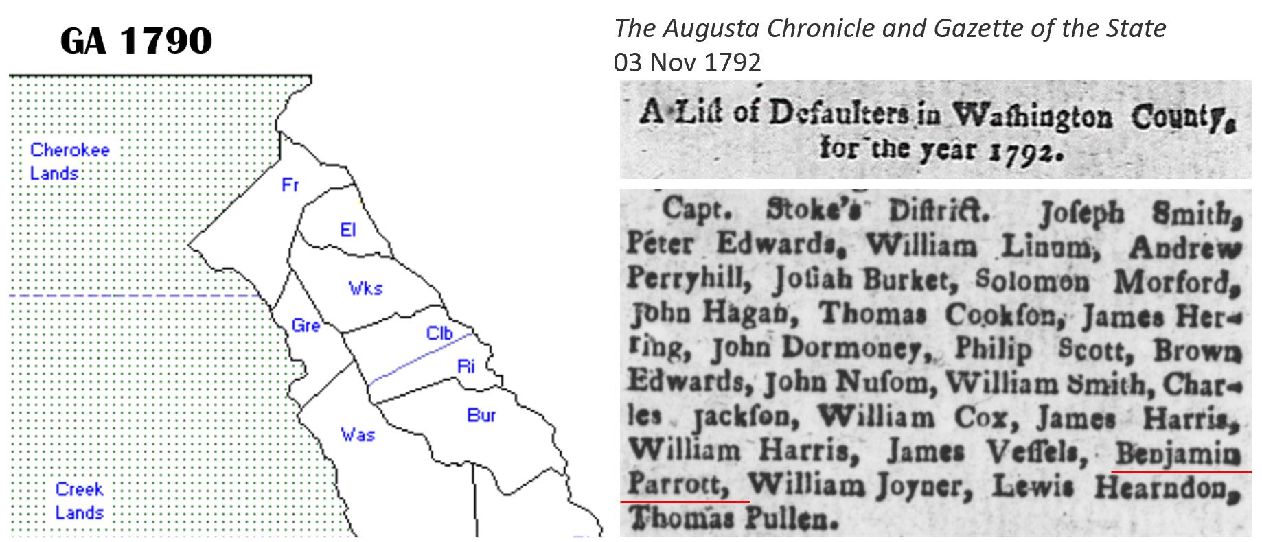 Benjamin Parrott Jr. appears in the record when he is witness to sale of land from Benjamin Sr to Abner, in Rockingham Co., North Carolina, May 1789, so he had to be of legal age by then, suggesting a birthdate ca 1768, some 10 years after the birth of his older brother, Abner. After the sale, the two Benjamins moved to Washingon county, Georgia. A fire in 1855 destroyed most records in Washington county, but newspaper ads list Benjamin (not sure of Sr or Jr) as a tax defaulter there in 1792. The the muster roll for 1793 from the in the reconstructed census for 1790 (a transcript is available on Ancestry) includes Captain Parrott's company, with Capt. Parrott being almost certainly the younger Benjamin. The older Benjamin also appears in the company.The area of Washington county settled by Benjamin went on to become Hancock county at the start of the 1800s. He married Rachel Harvey, and is listed in the tax digest for 1803, where his brothers-in-law also appear with land. "Benjamin Parrott, Jr. acquired land in 1804 (#164 in Hancock County, 2nd District [Note: need to find a copy of this record for verification), and is there for the tax digests for 1804."