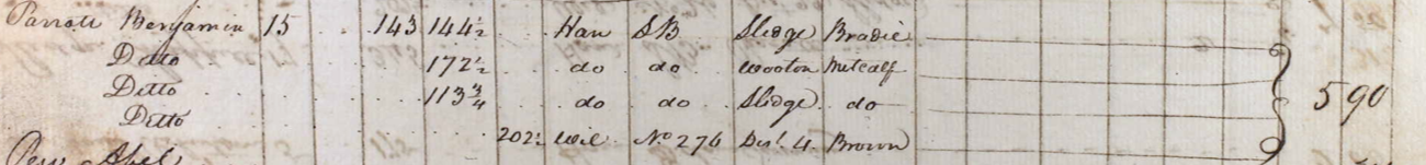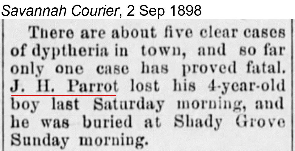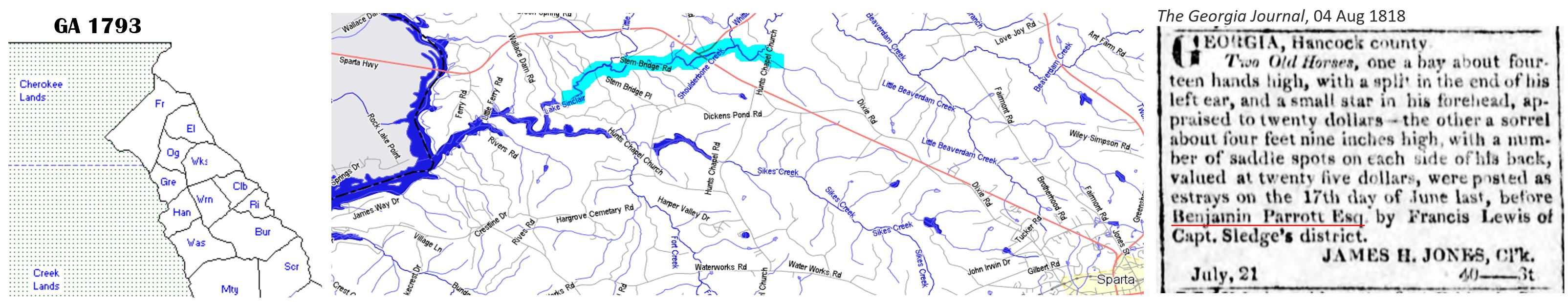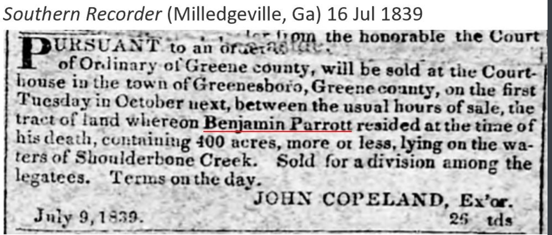 Benjamin Parrott Sr, oldest known ancestor: Benjamin (ca 1730 - bef 1809) is the earliest known ancestor of a group of Parrotts that traces back to the part of Guilford county that became Rockingham county, North Carolina, in 1785. Based on DNA, this group is part of a larger family that originated from a Lawrence Perrott in Kingston parish, Gloucester (now Mathews) county in Virginia. How they are connected remains unknown. Benjamin first appears in record on 18 Aug 1778, when he applied for a land grant. The next day, he was appointed an assessor for three districts in the area. Prior to that, Mavis Parrott Kelsey writes "I found Benjamin Sr. and Abner in Amelia County, VA where Benjamin sold out in 1774 before moving to Guilford/Rockingham County, NC." [Webmaster's note: have not managed to find or verity this record]. On 16 Dec 1778 he received his first land grant, which was for "500 acres on both sides of Wolf Island Creek, the water of Dan River, 'Beginning at the mouth of Gum Branch,' adjoining Jesse Hammons, W. Hills N.W. corner, Farlows and Fenlies. This grant is part of the land in the estate of Abner Parrott, which Benjamin Parrott, Sr. sold to Abner 9 May 1789 in an area which became Rockingham County in 1785." On 22 Oct 1782, Benjamin received his second land grant, for 640 acres 'On both sides of Burchfield fork of Wolf Island Creek'. "On 13 November 1779 he purchased a three-and-a-half acre tract from Jacob Stillwell on Wolf Island Creek. He bought twenty acres on Wolf Island Creek from Ambrose Nichols on 29 December 1783." His son, Abner, applied for a land grant on 18 Nov 1778, for which he received 640 acres on 22 Oct 1782 in Guilford County 'On both sides of Duncans Branch'. Therefore, Abner was of age late in 1778, meaning 1757, in turn meaning that Bejnamin was born ca Benjamin was likely in his mid forties at the time, which places his birth ca 1730. A 1783 reference to Parrott's Mill Creek south of the Dan River means that Benjamin must have run a mill like his Northumberland kinfolk did. The "mill of Capt. Benjamin Parrott" is mentioned in a 7 February 1820 petition to change the route of a road, showing that Benjamin's son continued the mill tradition once he moved to Georgia. Despite the attempts to reconstruct the family, there are indications that some of the early family members are still unaccounted for, particularly since several other children could have been born in the 10 years between Abner and Benjamin. Case in point, Benjamin's grandson, William, moved to Lunenburg Co., Virginia, where he lived a few years before moving to Leake county, Mississippi. While in Lunenburg, he had a close relationship with an older William Parrott. Given his age, this William was most likely an uncle. This uncle also mentions his neice, Susanna C. Beasley, in his will. Another grandchild had the unfortunate (for a female) name of Michael or Michal, and was married to John Powers. The name may have been unfortunate, but it is easy to follow in the records. John and Michael moved to Greene and then Monroe Co., Georgia. Court records in Greene county show John Powers had interactions with a Henry Blanton Parrott. Henry is now known have been born out of wedlock to Thomas Flippen and Nancy Parrott, both of Kingston Parish in Gloucester Co., where the Benjamin line also originated. There is a Parrott family in north Georgia whose earliest known ancestor is also from Rockingham county, NC, but there is no paper trail that links them to Benjamin. Indirect evidence is provided by an autosomal DNA match between a descendant of this family and a descendant of the James Ishmael Parrott family of Mississippi, which in turn is related to Benjamin Parrott's descendants. But, autosomal matches are not definitive. Unless additional documentation is found, a Y-DNA test is the only way to confirm this relationship. For more information on the atDNA match, see: Finally, to complicate the picture, two contemporary but unrelated Parrott families also settled in Greene county -- one was a Parrott family branch from the Richard Parrott of Middlesex group, and the other is the family of Henry Blanton Parrott. "Benjamin disappears from the North Carolina record after selling his land to [his son] Abner on 29 May 1789." As Benjamin Jr. witnessed both of these sales, he must have been of age at the time. Benjamin father and son joined the migration to Georgia: "Many of the North Carolinians came from Rowan and Mecklenburg and settled on Shoulderbone creek in Hancock." At the time Washington county had just been carved out of Creek territory and represented the leading edge of the western frontier. The Benjamins settled along Shoulderbone Creek, which "was one boundary of the fabulous tobacco land of Cracker's Neck in Greene, Putnam, and Hancock counties." Cotton rapidly supplanted tobacco as the main crop. On April 25, 1809, the Georgia Argus published a list of list of unclaimed letters remaining in the Sparta, Hancock Co. Post office, on the first day of April 1809. Benjamin Parrott is listed. Then, on 9 Jan 1810, the Georgia Argus published the list of defaulters in Hancock county for 1809. Captain Sledge's district included the Widdow Parrott, who may have been Benjamin Sr's widow, and whose name remains unknown. If so, it indicates that Benjamin was no longer alive by then. Alternatively and perhaps more likely, the Widdow Parrott was his daughter-in-law, Elizabeth Parrott, widow of Abner Parrott Sr., who had moved to Tennessee. |