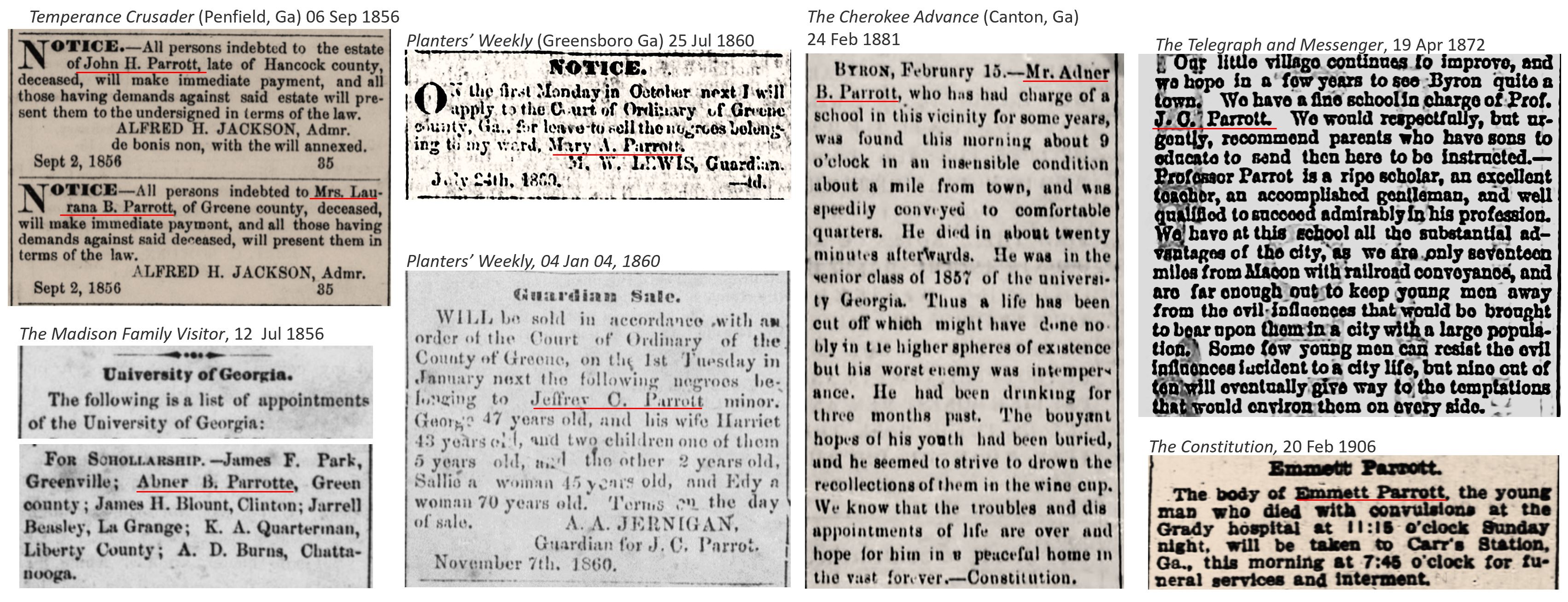 His second son, Abner B. (1800-1822), attended the University of Georgia in 1821, followed by the Litchfield Law School in Connecticut before his untimely death. His obituary read, "Abner Parrott, Esq., 22 year old son of Benjamin Parrott Esq. of Hancock County, Georgia died 23 December 1822 in the Village of Newtonborough in Newton County, Georgia. He had just entered the profession of law." His third son, Jesse, simply disappeared from the record by 1837. Benjamin himself died in 1839, and his property was sold at the courthouse. This just left Benjamin's oldest son, John Harvey Parrott to continue the line in Georgia. John married Laurana Lewis and had four sons and three daughters, Julia, Mary, and Louisa. John died while all his children were minors. His oldest son, Abner B., followed in the footsteps of his namesake uncle, and graduated from the University of Georgia. When the War broke out, he enlisted on 15 Jul 1861 as a private and mustered into "I" Company of the Georgia 59th Infantry. He was wounded and taken prisoner at Gettysburg, and transferred to the Union hospital at David's Island, New York Harbor, from where he was exchanged in City Point,VA. On 28 Feb 1965, Abner is listed as absent without leave. Returning to Georgia, he worked as a school teacher until he passed out in a snowbank from over consumption and died of hypothermia in 1881. He never married. John H. Parrott, Jr., the second son, disappears from the record after 1860. Private Parrott, Stephens Light Guards, Company 1, 8th Ga. Regiment, who was discharged on 06 Feb 1861 due to illness. He must have rejoined the company, as he was a musician for the company at Manassas. Cosby, the third son, died at age 12, leaving the youngest son, Jeffrey C., to continue the line. Jeffrey C. was a school teacher who moved around the state. He married and had two sons; Forrest died in infancy, and Emmett died unmarried in Atlanta at age 33. Thus Benjamin's Parrott line came to an end in Georgia.