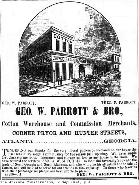 Two sons, Samuel F. and George W. Parrott, are leading business men of Atlanta. Samuel Parrott is president of a aleading bank and a large cotton dealer. George W. Parrott is one of the railroad commissioner of the state of Georgia, also prominent in business circles.