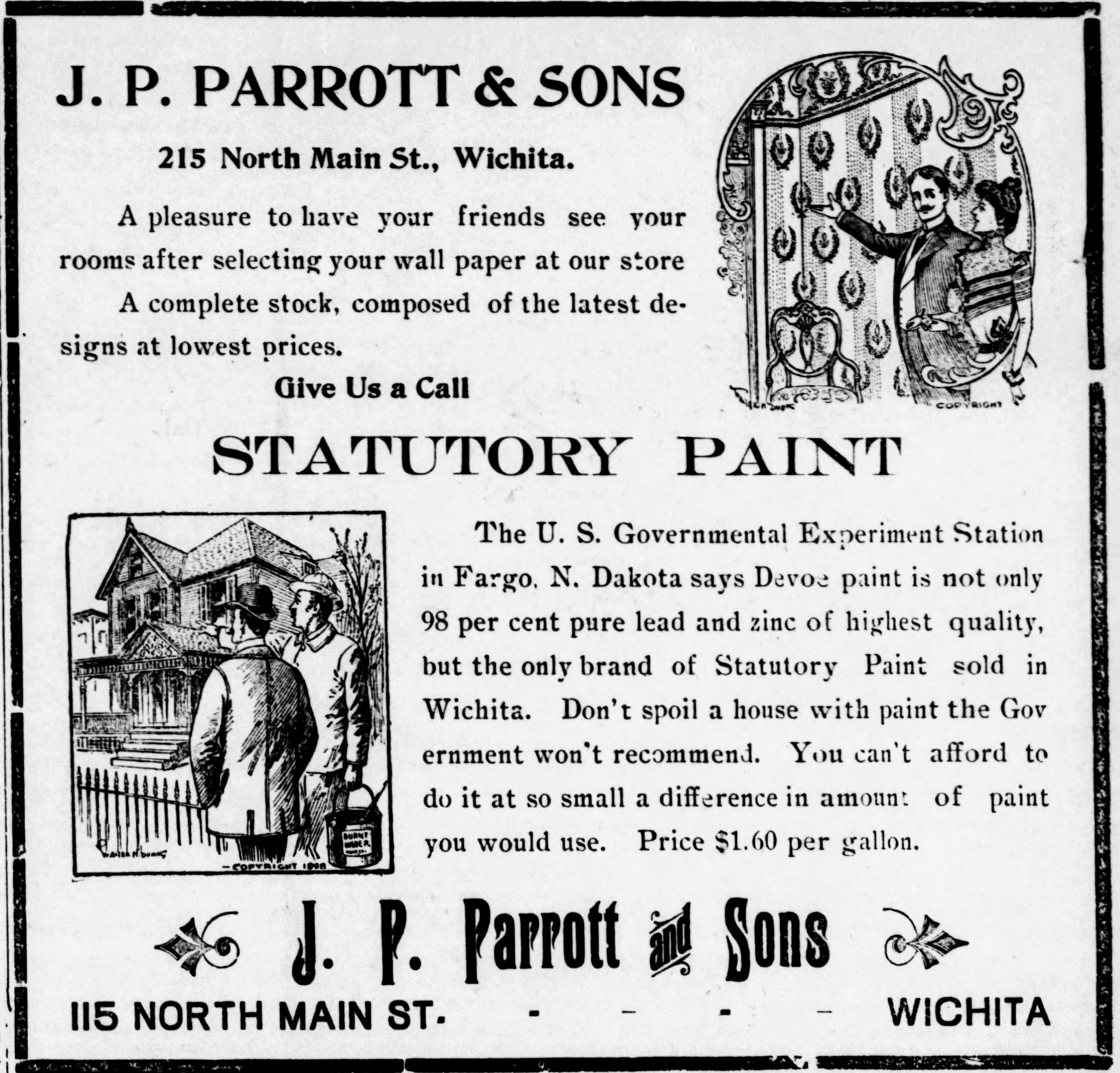 .Notes: .J.P. PARROTT & SONS. Occupying a prominent position among the business concerns of Wichita, and enjoying a business that is constantly increasing, is the establishment of J.P. Parrott & Sons. This concern is located at 152 North Main street. J.P. Parrott & Sons carry a large line of the latest styles and patterns of wall papers, decorative novelties, etc., at prices that are always reasonable. This concern has won the entire confidence and esteem of the citizens of our city, as it is known for the reliability of its goods and work. The membersof this firm are wll known and progressive business men who believe in treating every patron, whether rich or poor, in a most courteous manner, and of doing all work promptly. It will pay you to call on J.P. Parrott & Sons when in need of anything in their line.