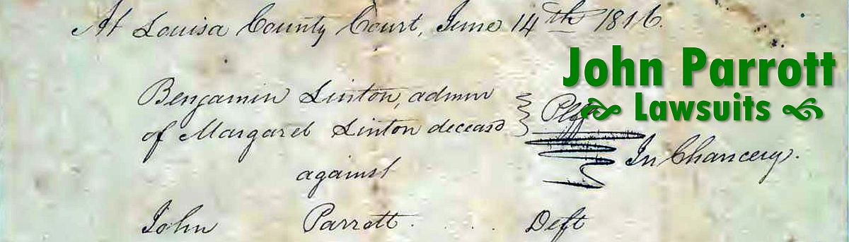 Transription by Peggy Parrott Feige & Wayne Parrott In this case filed in Nov. 1810, the tables are turned, and John Parrott sues his sson-in-law, Benjamin Linton. John considered himself to be his dead child's heir, and thus entitled to the proporty the child had inherited from its grandfather, Thomas Yerby. Instead, his surviving daughter and her husband ended up with the property, and after the daughter's death, John wanted the property back. That John Parrott and Frances Yerby Parrott were the parents of Peggy Parrott Linton is confirmed, as is Peggy's marriage to Benjamin Linton in 1802 and Frances Yerby Parrott's death in 1795. It specifies that the other child of John Parrott and Frances Yerby died Sept 1793. The case was dismissed by John in July 1927, almost 17 years after he filed it. 1827 - 026, Louisa County - Chancery Causes: John Parrott vs Benjamin Linton To the Court of Louisa in Chancery sitting humbly