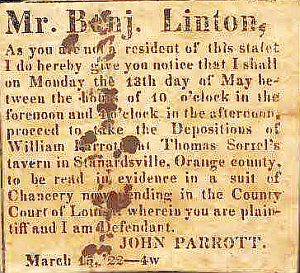 This case was filed in August 1805 when Peggy Parrott's husband, Benjamin Linton, sued her father, John Parrott, to recover the income generated by a slave Peggy had inherited from her grandfather, Thomas Yerby, but which John had rented out since her death. Peggy was named specifically in Thomas Yerby's will. Her father was John Parrott and her mother was Frances Yerby Peede. Frances had two children with John Parrott, one died young and the other was Peggy (aka Margaret). Frances Yerby died in June 1795, and Peggy married Benjamin Linton on the "13th or 14th February 1802. The case finally ended in June of 1823, when the plaintiff was awarded the court costs, but did not recover the lost income. A copy of Thomas Yerby's will is also included in this case file. Transription by Peggy Parrott Feige & Wayne Parrott 1823 -01.......................................................Peggy...........John Image Source: Continental Gazette, http://www.lva.virginia.gov/chancery/full_case_detail.asp?CFN=109-1823-021#img white space No reply ^ Ex'd 2nd Summons Front page Augt 1805