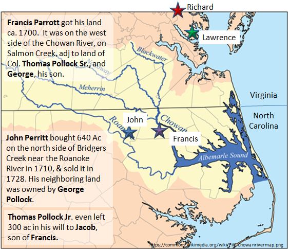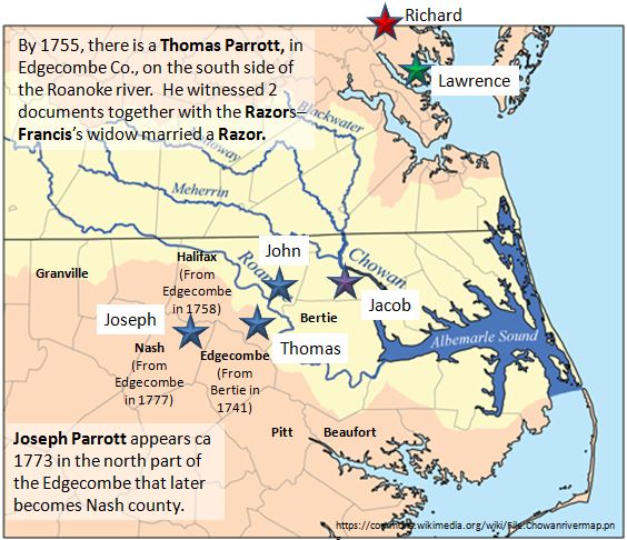 The best known of the North Carolina Parrotts from this region of the state is Francis Parrott. Volumes have been written trying to connect him to contemporary Parrott families in Virginia and Maryland, but no attention has been paid to possible relationships with the other Parrott families living near him and his descendants. The North Carolina Parrotts settled on what was then the western frontier of the Colony, and moved west as the frontier expanded. It is not known when Francis got his land, but he was in the area by 1691. His land was on Salmon Creek, on the west side of the Chowan River. A contemporary, John Perritt, bought 640 acres in 1710 on the north side of Bridger's Creek near the Roanoke River, some 80 miles to the west of Francis. George Pollock, son of Col. Thomas Pollock, Sr. had land adjacent to both of them. Thus, Pollock would represent a connection between John and Francis. Alternatively, it could simply be a coincidence. By 1755, there is a Thomas Parrett, in Edgecomb Co., on the south side of the Roanoke river, who was a probable son of John. He crossed paths with the Razors -- Francis's widow married a Razor, again suggesting that John, Thomas, and Francis were part of the same social group. There are no Parrotts alive today who have a paper trail back to John. However, other Parrotts show up in nearby counties, and they may well be John's descendants. Records for the time and the area are incomplete. Joseph, founder of this Nash group, bought land in 1773 in what is to become Nash county. A William Parrott, patriarch of the Granville Parrott branch, is in Granville county by ca. 1800. More Parrotts appear in Pitt county by the mid 1850s, beginning with Benjamin. From where they expanded into Beaufort county. The maps below show the locations of the various Parrott families mentioned here. |