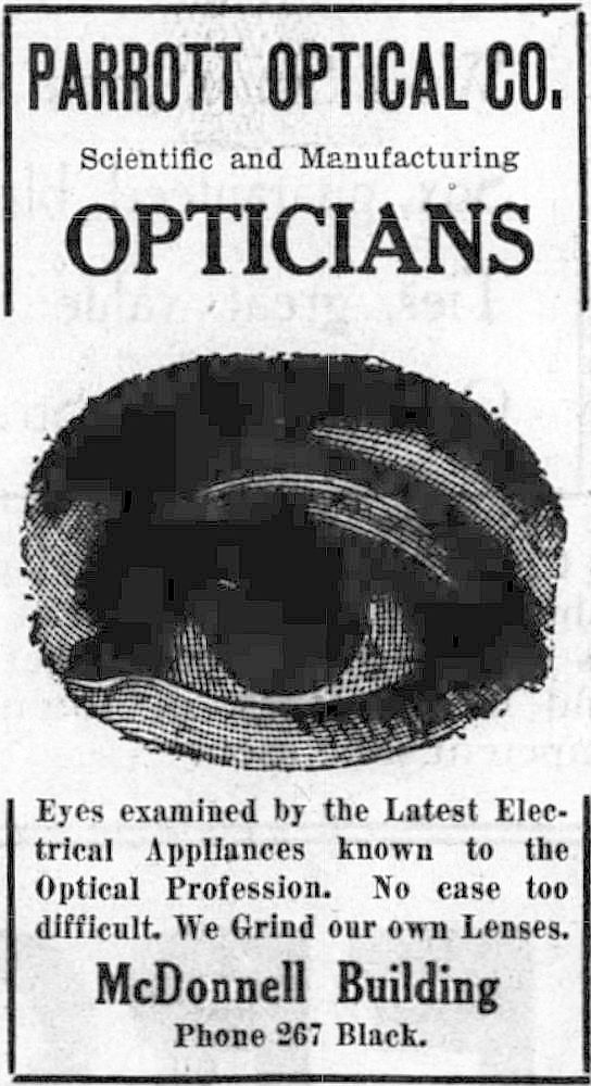 George Parrott immigrant in Michigan • 25 people in the tree, but living individuals have not been knowingly posted • Comments? Corrections? Additions? Please write. Left: Advertisement from Parrott Optical, belonging to Robert Arnold Parrott, from The Twin Falls Times, 22 Sep 1910