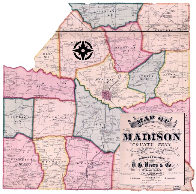 Right: Robert settled somewhere in district 10 of Madison county, Tennesssee, marked here by the compass symbol. The 1850 census indicates he was a farmer who had 2500 acres. Map is of county as it was in 1877 and is from Library of Congress Maps
