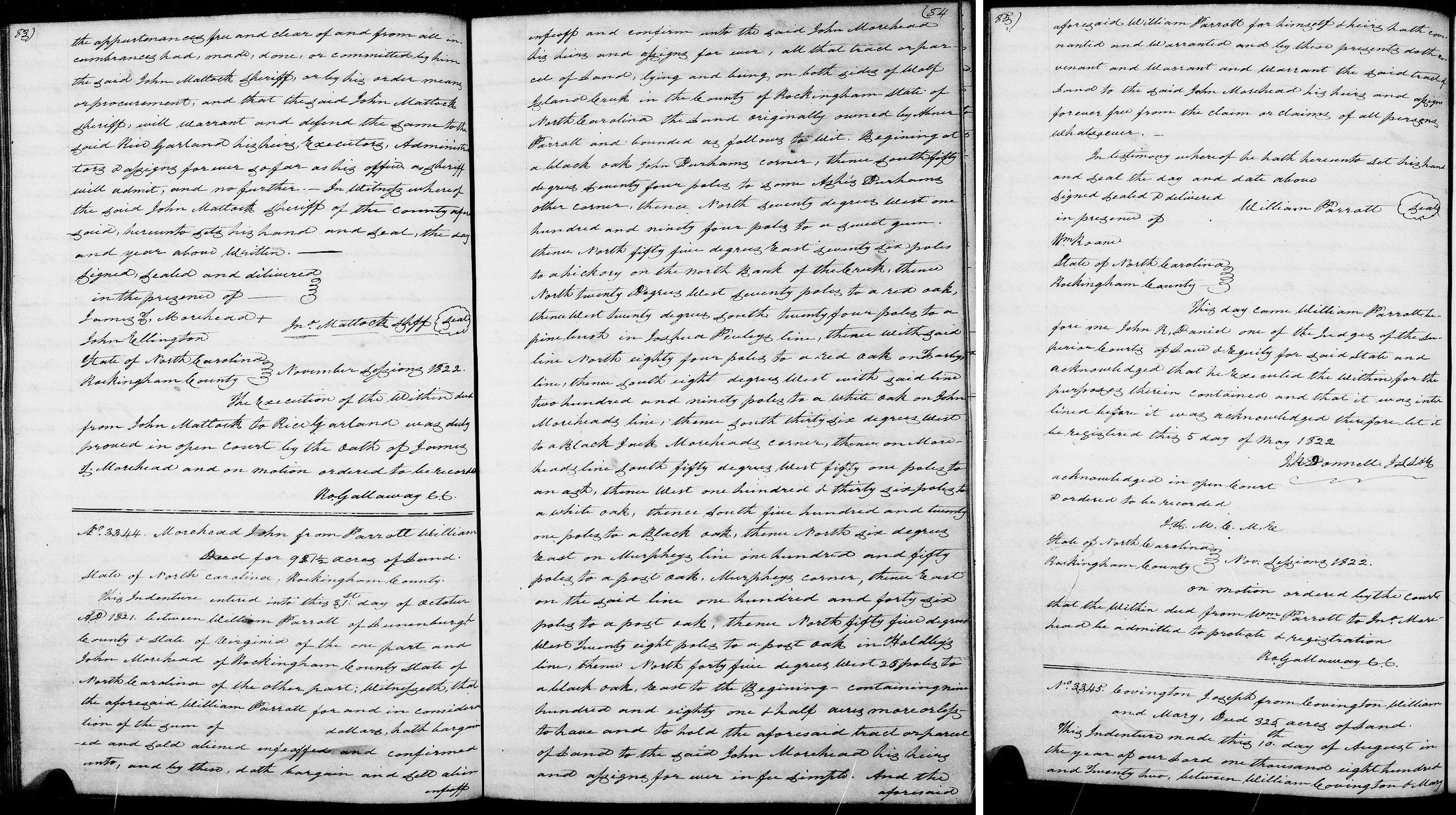 Deed for 97 1/2 acres of land. State of North Carolina, Rockingham County. This indenture entered into this 31st day of October AD 1821 between William Parrott of Lunenburgh County of State of Virginia of the one part and John Morehead of Rockingham County State of North Carolina of the other part; Witnesseth, that the aforesaid William Parrott for and in consideration of the sum of dollars hath bargained and sold aliened enfeoffed and confirmed unto, and by these, doth bargain and doth alien enfeoff and confirm unto the said John Morehead his heirs and assigns for ever, all that tract or par- cel of land, lying and being on both sides of Wolf Island Creek in the County of Rockingham State of North Carolina the land originally owned by Abner Parrott and bounded as follows to wit. beginning at a black oak John Durhams courner, thence south fifty degrees seventy four poles to same ____ Durhams other corner, thence North seventy degrees west one hundred and ninety four poles to a sweet gum. thence North fifty five degrees East seventy six poles to a hickory on the north Bank of the creek, thence North twenty degrees west seventy poles to a red oak, thence west twenty degrees south twenty four poles to a pine bush in Joshua Penleys line, thence with said line north eighty four poles to a red oak and Farleys line, then south eight degrees west with said line two hundred and ninenty poles to a white oak and John Moreheads line, thence south thirty five degrees west to a Black Jack Moreheads corner, thence _______ __________ line south fifty degrees west fifty one poles to an ash, thence west one hundered & thirty six poles to a white oak, thence South five hundred and twenty one poles to a black oak, thence north six degrees east on Murphys line one hundred and fifty poles to a post oak, Murpheys corner, thence East on the said line one hundred and forty six poles to a post oak, thence North fifty five degrees west Twenty eight poles to a post oak in Holdleys line, thence North forty five degrees west 25 poles to a black oak, East to the Beginning - containing _____ hundred and eighty one & half acres more or less- to have and to hold the aforesaid tract or parcel of land to the said John Morehead his heirs and assigns for ever in fee simple. And the aforesaid William Parrott for himself & heirs hath com parted and warreanted and by these presents doth co venant and warrant and warrant the said tract of land to the said John Morehead his heirs and assigns forever free from the claim or claims of all persons whatsoever.-