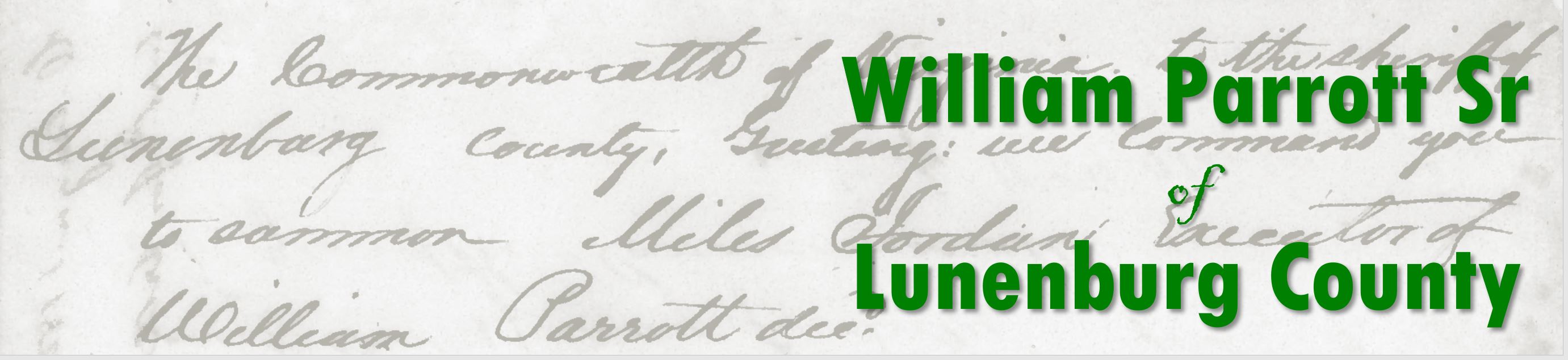 William Parrott (ca 1750 - 1824), another member of this family, lived in Lunenburg county, Virginia. No known paper records prove his parentage, but it can be inferred from other existing records. In particular, on 31 Oct 1821, William sold a tract of land in Rockingham county that had previously belonged to his presumed brother, Abner Parrott. William first appears in the record in 1774: