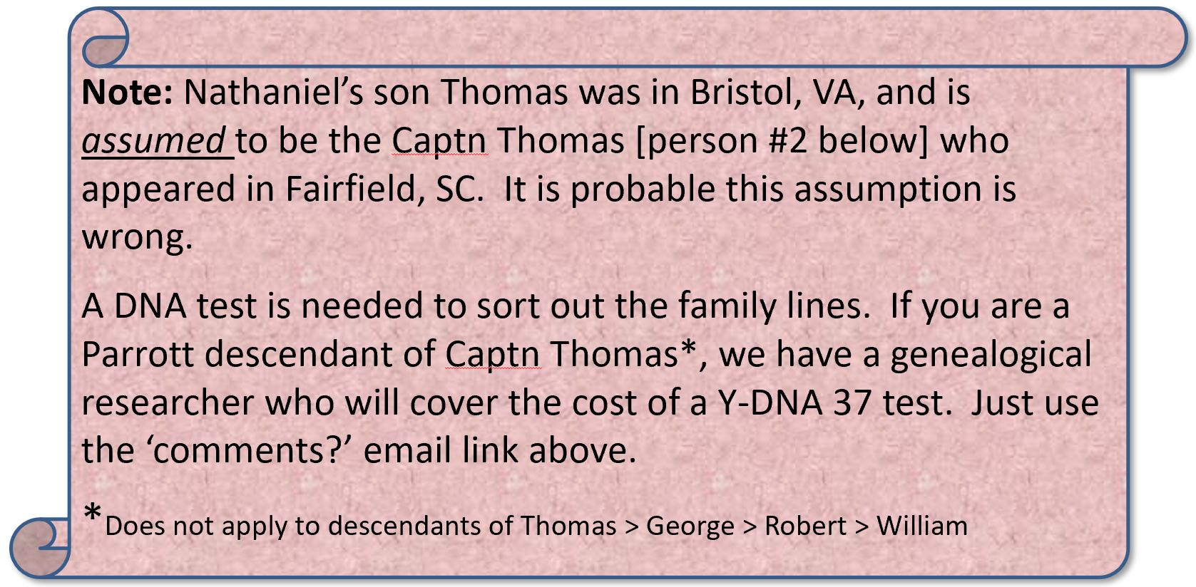 2. Capt. Thomas Parrott Sr. (Nathaniel Sr.1) was born on 30 Dec 1724 in Bristol Parish, Virginia and died in 1797 in Fairfield Co., South Carolina, at age 73.