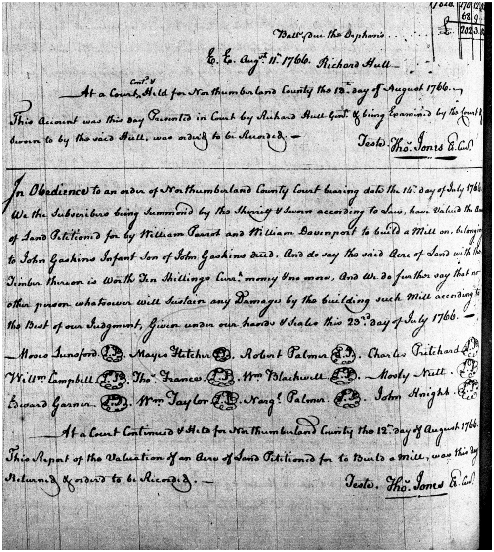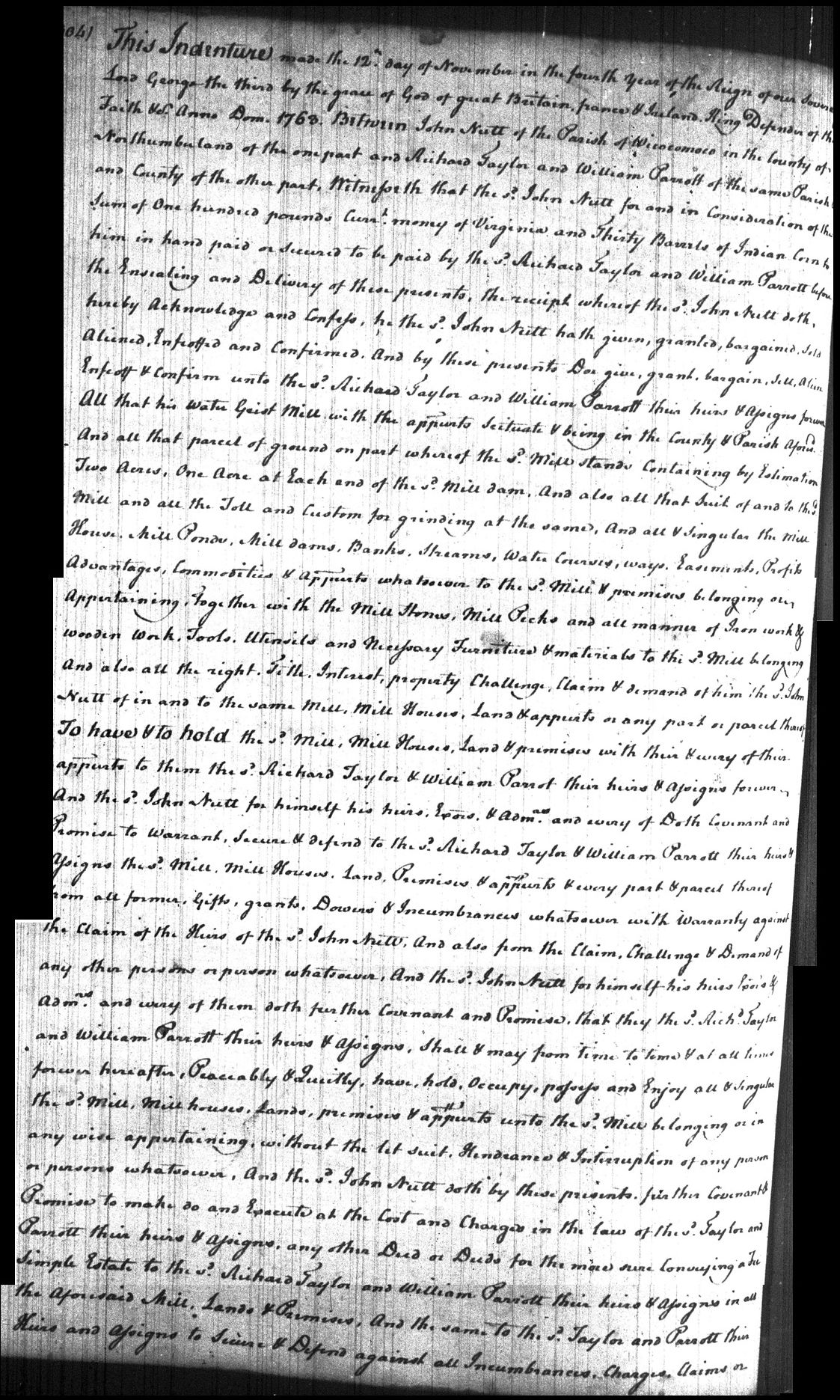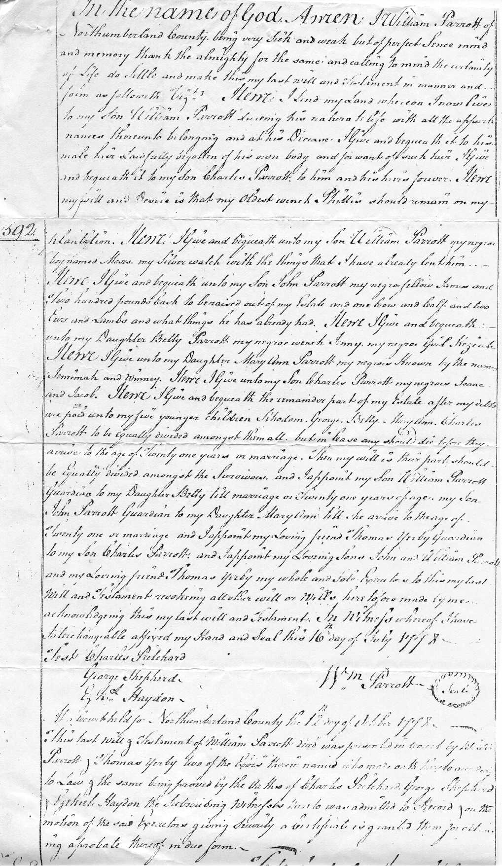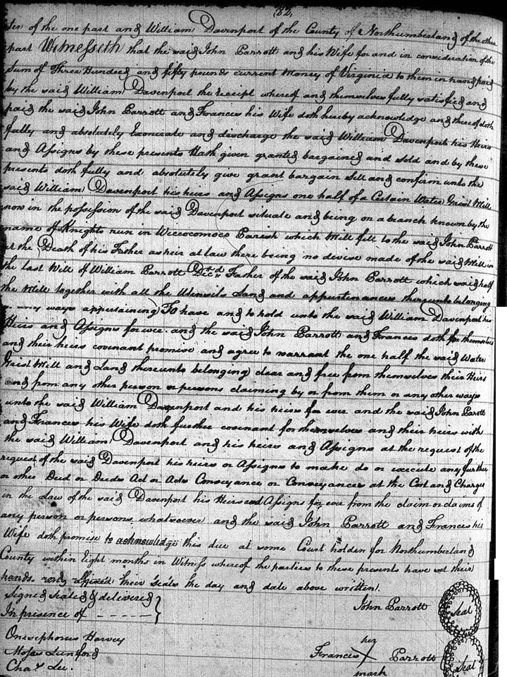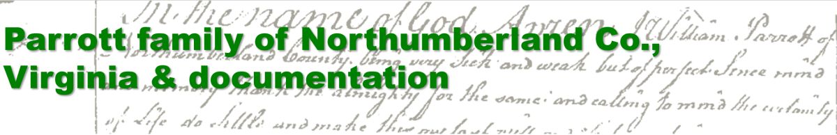 While in Northumberland, the Parrott family lived in Wicomico parish. Few records have survived for Wicomico Parish. Lawrence appears in the vestry record for Wicomico Parish in Northumberland County on 2 August 1743, when it was ordered that Lawrence Parrott be one of the land processioners for the precinct. Two years later, Laurence Parrot was recorded as owing the parish £200 at a vestry meeting on 12 October 1745. Lawrence was married to Mary (ca 1715 to 1755), whose maiden name has been the subject of much speculation. They had a daughter, Mary Ann (ca 1731-1807, see explanation of how her birthdate was calculated), who married Richard Haynie (d ~1754) ["Richard Haynie & Parrott, [married] before 11 April 1748; bride was a daughter of Lawrence Parrott" from Northumberland County Record Book 1747-1749, p 79, as given in Headley, R.K. Jr., Married Well & Often: Marriages of the Northern Neck of Virginia 1649-1800, p 174.] Mary Ann next married Elisha Betts (1720 - 1784). Her will was signed 5 June 1802 in Cumberland Parish, Lunenburg Co., and recorded on 10 Dec. 1807 by Charles Betts (Lunenburg Will Book #6, 1802-09, pages 201-202). Elisha Betts had a plantation in Lunenberg Co., Virginia, and the overseer in 1775 for this plantation was a John Parrott, married to Ruth. However, this John is from a completely unrelated family. Lawrence and Mary also had a son, William, who was born ca 1732 and died 1778. Proof that Lawrence and William are linked is established by Fillis, James, and Winney, slaves named in the property inventory of Lawrence. Phillis, James, and Winney later appear in the will of William Parrott, tying Lawrence to William. A son William is also named in the will of Mary Parrott, widow of Lawrence. Wlliam was born and lived his entire life there. He married Hannah Hughlett (ca 1735-1772), and the couple gave birth to 2 daughters and 5 sons who were born and raised there as well. Four of the sons survived, but left Northumberland county and went their separate ways, thus continuing this Parrott lineage in central Kentucky and Virginia. William Jr., the eldest son, inherited the family land, but was prevented from selling it by the terms of his father's will. He was still paying taxes on it in the early 1790s, although he was already living in Orange county at the time. Besides the family farm, the Parrotts bought a grist mill off Knight's Run in 1763, which son John received as his father's heir-in-law. The mill pond is still visible today. They petitioned to build a second one in 1766. The Parrott farm was just south of the Great Wicomico River (see discussion below), near their mill on Knights Run, somewhere west of the Howsons, but east of Knight's Run. In turn, the Howson property was bounded by Fishing Creek (now Tipers Creek) on the east and the Lawrence Parrott property on the west. Today, after crossing the Great Wicomico, Jessie DuPont Memorial Highway runs parallel to Tipers Creek before the two finally intersect. The last records of the family in Northumberland are from the tax lists of the 1780's, when William Jr is still paying taxes on the family farm, before he follows his brothers and moves away. All in all the Parrotts were in Northumberland county for only about 50 years. Note that the earliest documents were burned in a fire in 1710. In addition, the Record Book for Northumberland for 1713 - 1718 is lost. The remaining references are posted here as they get found: |