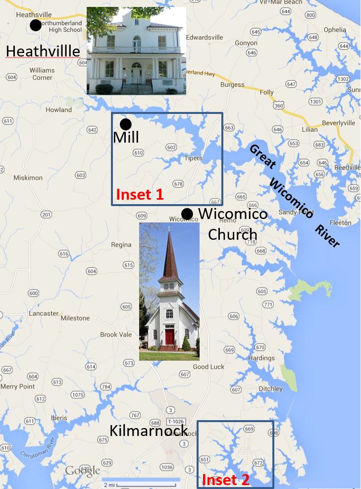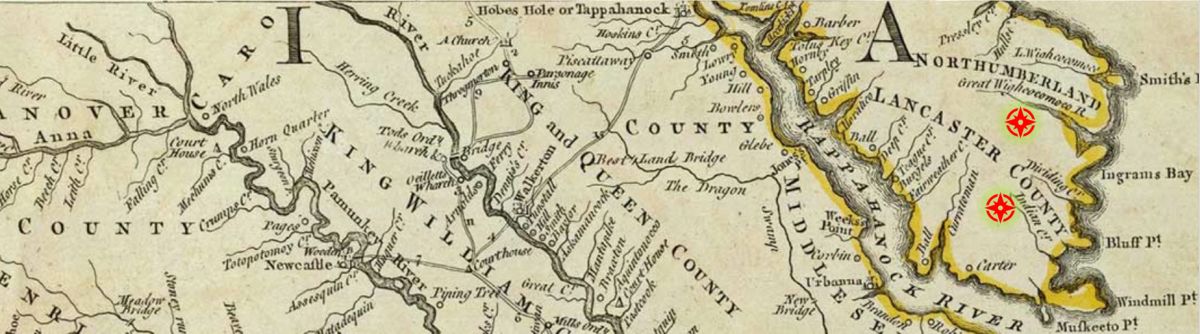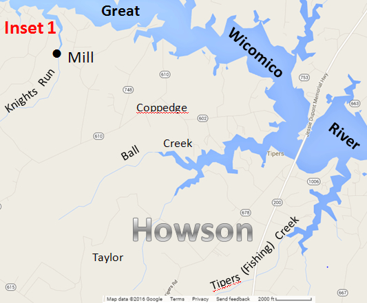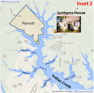 This map illustrates the places named in the documents. The two square insets show the areas where the Parrott plantation might have been. As accounts of the day suggest, traveling by water was easier than trying to travel over land. Towns and churches were conveniently located near the head waters of navigable streams. Inset 2 at the bottom of the top map ecompasses the area around Indian Creek, magnified in the middle map, with the shaded area depicting the reported location for the Parrott plantation. Dr. Walter L. Moore (1906-1997), himself a William Parrott descendant, visited Northumberland county in an attempt to find the location of Parrott properties by speaking to local residents. He later relayed the information to another family member, WB Parrott, who shared it at the time. The green triangle on the lower map indicates the location where the actual house is said to have stood, supposedly into the last century. According to what Dr. Moore relayed, it stood across the water from the end of what today is road 1115. This property is just 2.5 miles east of what is now Main street in Kilmarnock. The area can be reached by taking highway 200 out of Kilmarnock, turning east on 608, and right onto Clifton Landing Road. The property originally encompassed 300 acres, which is the approximate size of the penninsula defined by the forks in Indian Creek; thus it is possible that the Parrott plantation occupied the whole penninsula, as speculated in the diagram. In this case, much of Clifton Landing Road would be on former Parrott lands, while the house itself would have been at the end of the road. It must be emphasized that not a single document has been found that can corroborate the location of the Parrott lands, so Dr. Moore's account cannot be verified. To the extent that neighbors were often called to witness wills, that Mary Parrott's will was witnessed by Ann Linum suggests the account could be correct. The Linum house, originally owned and built by John Lynum in 1678, still stands as the Lynhams House. It is on the corner of N and S Sioux road (1107) and is shown by the orange triangle on the middle map. The location would make the Lynums neighbors living just an easy boat ride across Indian Creek in Bluff Point. The two houses would have been separated by the distance of just 2 football fields. The location off Indian Creek was far removed from the places named in the documents. Court was held in Heathville, the Northumberland county seat that was 30 miles distant. Attending church in Wicomico would have required a 9-mile ride. Later, the family built a mill that was 6 miles beyond the church, or 15 miles away from the reported homestead. It is surprising that the family chose to build mills so distant from their main plantation. And, for someone living on a penninsula, it is surprising no boats were mentioned in Lawrence's inventory. Finally, the Lynum land became part of the plantation of Robert Clarke Jacob, which in turn got sold in 1780, and the Parrotts were not listed as neighbors. That said, other information suggests the Parrott lands were actually south of the Great Wicomico River, near their mill on Knights Run. This area is shown by the inset 1 near the top of the top map, which is magnified in the bottom map at left. A Deed of Lease places the Parrott land somewhere west of the Howsons, but east of Knight's run. In turn, the Howson property was between Fishing Creek (now Tipers Creek) and the Lawrence Parrott property. Several documents besides this deed show that the Howson property was bounded by Fishing Creek. Today, after crossing the Great Wicomico, Jessie DuPont Memorial Highway runs parallel to Tipers Creek before the two finally intersect. |