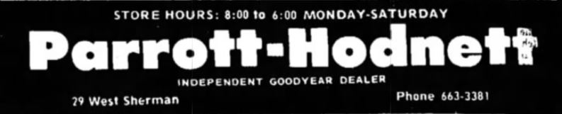 1: Parrott-Hodnett Goodyear dealership, owned by Ivo William Parrott (1900-1977), Hutchinson, Kansas 2: Parrott Real Estate & Auction, owned by Zane Elliott Parrott (1989- ), Lawrenceville, Illinois 3: Gregg Parrott Auction Service, owned by Gregory L Parrott (1955- ), Lawrenceville, Illinois - predecessor to Parrott Real Estate & Auction 4: Ervin Jacob (1902-1983) was a grocer in Campbell county, Tessessee in the 1930s 5: William Harrison Parrott Jr (1917-1987)owned a Gulf service station in La Follette, Tennessee |