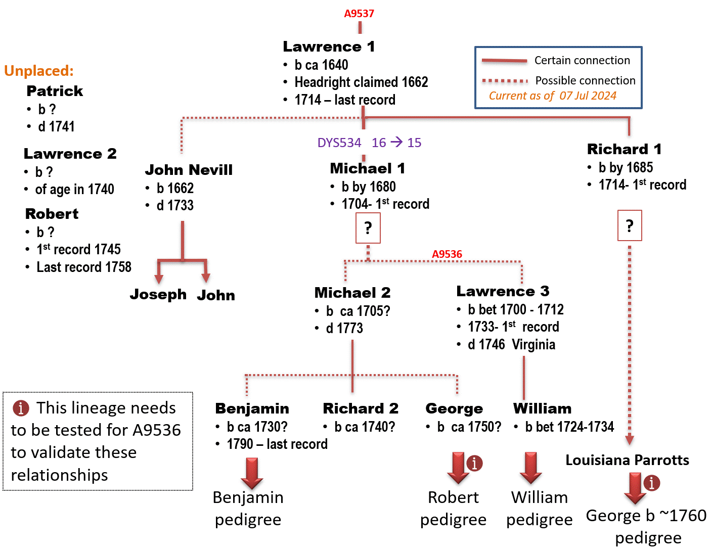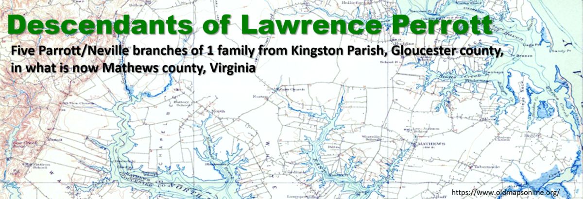 Download a copy As headrights are currently understood**, the only fact that can be inferred from this headright is that the elder Lawrence was in the Colonies by 1662. It does not mean that Lawrence was indentured to John Singleton-- headrights could be claimed on friends and relatives. Likewise, it does not mean that Lawrence arrived in 1662, or that John Singleton did the transportation-- the arrival in the colonies could have been years earlier, and John Singleton could have bought the headright from someone else. Lawrence has been reported to have later sold headrights in Maryland in the 1660's and owned land in Baltimore, but no documentation has been found to support these claims. Nothing is known of Lawrence's whereabouts for the next 16 years, until he appeared in Kingston Parish, Gloucester county, Virginia. Today, there are 4 Parrott families that DNA testing shows descended from the Lawrence the original immigrant. Unfortunately, the documentation showing how these families descend from each other has not survived. In addition to the 4 Parrott families, there is a fifth family that uses the surname Nevill. The elder Lawrence settled down in Kingston parish near the property of John Neville. The 1704 rent roll for Kingston parish in Gloucester county shows both living there. Today, the Y-DNA of the Parrott & Neville descendants is indistinguishable from each other. Furthermore, DNA shows these families are completely distinct from all other contemporary Parrott and Neville families in the colonies that have been Y-DNA-tested. So while the records show John Nevill Sr. to be the founding ancestor of these Nevills, the line was most probably fathered by Lawrence, who was some 20 years his senior (And assuming John Sr and Lawrence were not related). There is tantalizing evidence both families were together in Barbados prior to arriving in Virginia***. *Land Office (Patent Record) John Singleton, enters rights, ca. 1662, Liber 5, ff. 238, MSA SM2-8, Microfilm no. SR 7347; Maryland State Archives, Annapolis, Maryland. Transcription of Land Office (Patent Record, Original) Liber X, ff. 302., Transcription by Michael Hait, 2008, www.haitfamilyresearch.com. **Kilby, Craig M. 2013. People move. Land does not!. Germanna Research Group Journal, Spring, pp 13-19. ***John Neville's father might have been in St. Michael's parish, Barbados, as suggested by his connection to Duncan Bohannan, another neighbor in Kingston Parish. Duncan Bohannan -mentioned in the Neville land patent - was in St. Michael's parish, Barbados, where he got married prior to his move to Kingston Parish in Virginia. Other Nevilles and Perrotts were also there, as well as in the adjacent Christ Church Parish. So while the documents suggest a Neville connection between Barbados and Kingston parish, it remains to be established whether any of the Perrotts of Barbados were related to Lawrence before any conclusions can be made. |