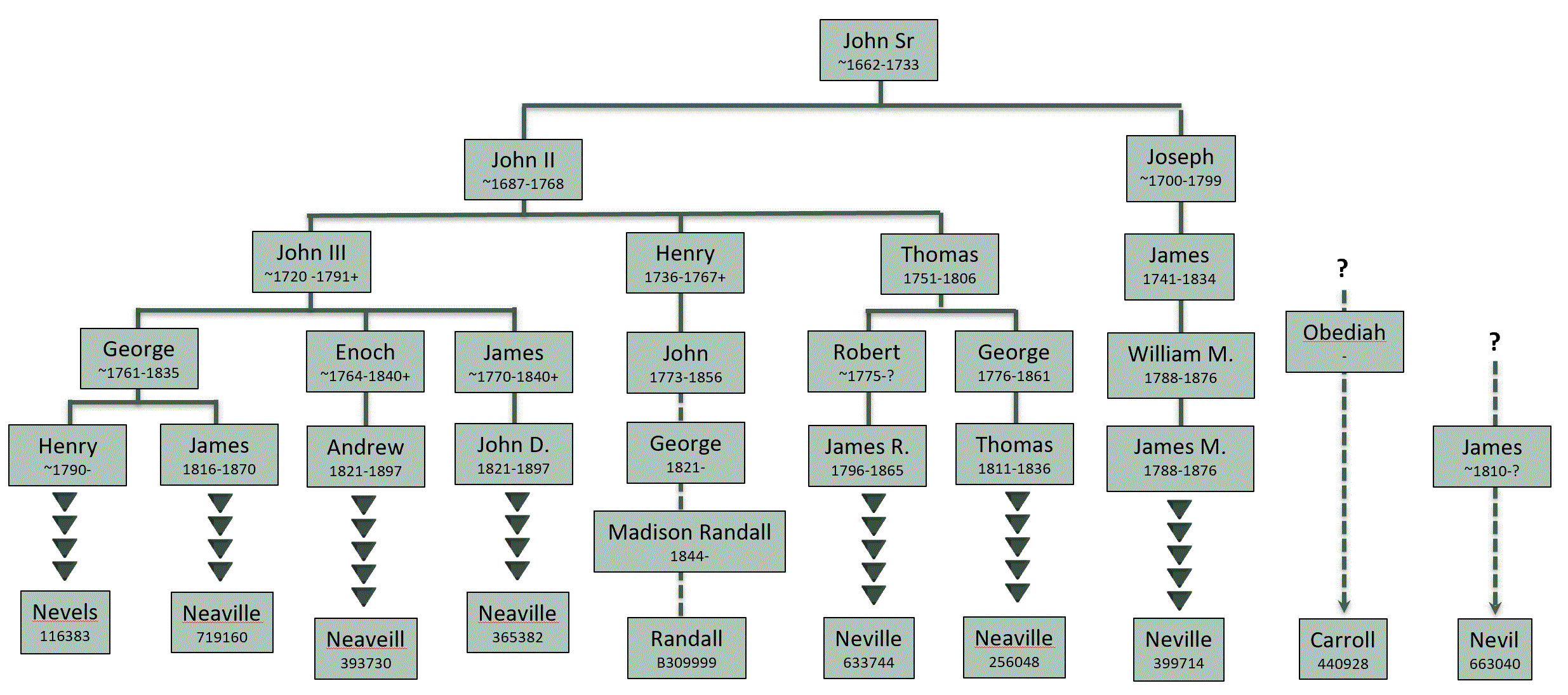 The earliest known ancestor is John (Neavill) Neville, Sr. (1662 probably Warwickshire Eng - 1733 Goochland VA).